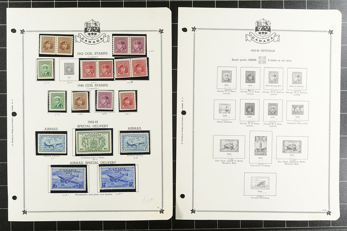 Minkus Mint Collection Part A. The run of 1859-1985, housed within a deluxe padded / illustrated green 3-ring album, with matching Minkus pages going back to 1851 and black mounts added for the stamps. Loads of value here, with primarily used earlier issues including Cents, Large Queens, Small Queens, Maps, Leafs, Numerals, Edwards, Tercentenary, Admiral and strong George V era. A bit mixed condition on the earlier material, but lots of better stamps here, expect the mint to be Hinged / Hinge Remnant, but with some Never Hinged mixed in to act as a bonus once discovered. Includes "back of the book" for the period as well. The catalogue value would likely easily encroach on $8,000-$10,000. Offered intact from a local estate. Estimate =