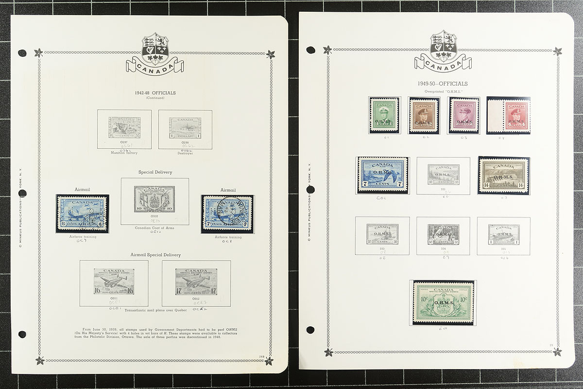 Minkus Mint Collection Part A. The run of 1859-1985, housed within a deluxe padded / illustrated green 3-ring album, with matching Minkus pages going back to 1851 and black mounts added for the stamps. Loads of value here, with primarily used earlier issues including Cents, Large Queens, Small Queens, Maps, Leafs, Numerals, Edwards, Tercentenary, Admiral and strong George V era. A bit mixed condition on the earlier material, but lots of better stamps here, expect the mint to be Hinged / Hinge Remnant, but with some Never Hinged mixed in to act as a bonus once discovered. Includes "back of the book" for the period as well. The catalogue value would likely easily encroach on $8,000-$10,000. Offered intact from a local estate. Estimate =