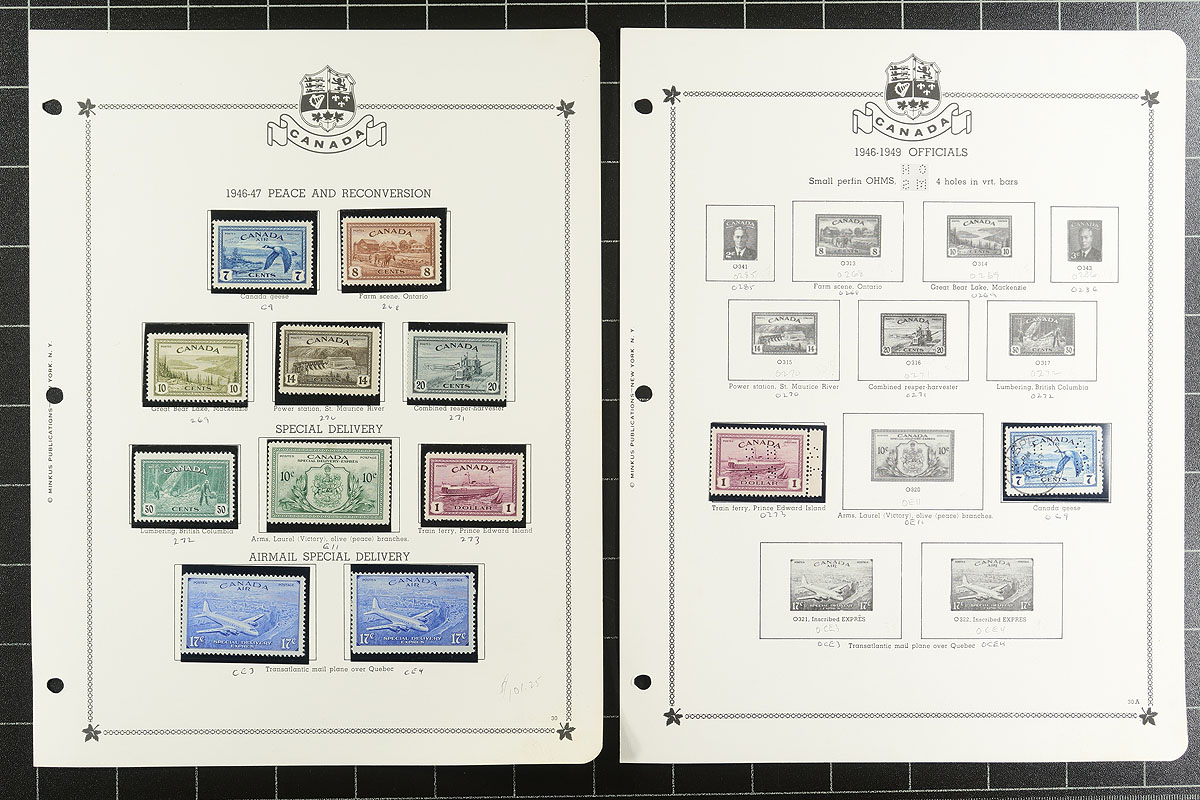 Minkus Mint Collection Part A. The run of 1859-1985, housed within a deluxe padded / illustrated green 3-ring album, with matching Minkus pages going back to 1851 and black mounts added for the stamps. Loads of value here, with primarily used earlier issues including Cents, Large Queens, Small Queens, Maps, Leafs, Numerals, Edwards, Tercentenary, Admiral and strong George V era. A bit mixed condition on the earlier material, but lots of better stamps here, expect the mint to be Hinged / Hinge Remnant, but with some Never Hinged mixed in to act as a bonus once discovered. Includes "back of the book" for the period as well. The catalogue value would likely easily encroach on $8,000-$10,000. Offered intact from a local estate. Estimate =