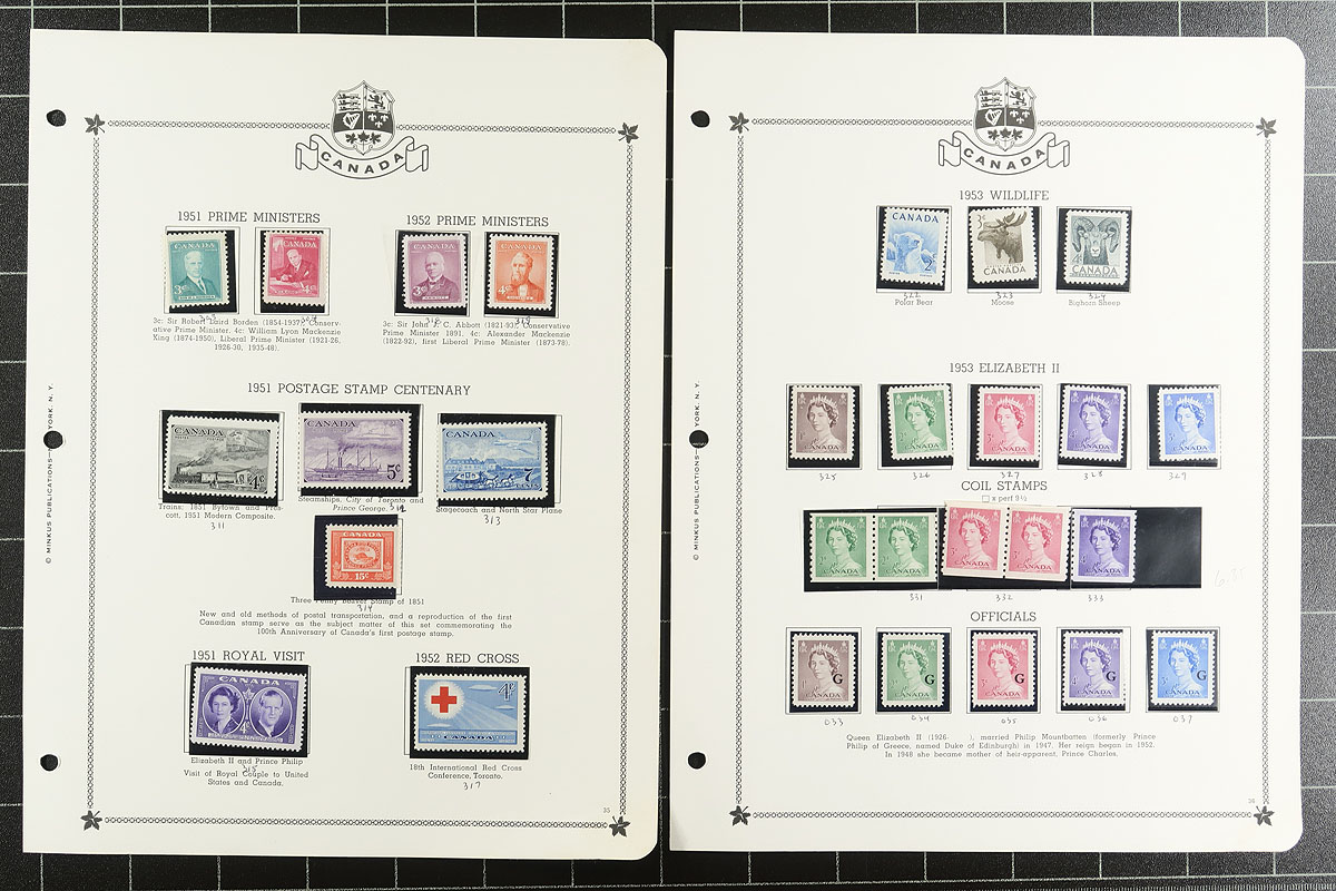 Minkus Mint Collection Part A. The run of 1859-1985, housed within a deluxe padded / illustrated green 3-ring album, with matching Minkus pages going back to 1851 and black mounts added for the stamps. Loads of value here, with primarily used earlier issues including Cents, Large Queens, Small Queens, Maps, Leafs, Numerals, Edwards, Tercentenary, Admiral and strong George V era. A bit mixed condition on the earlier material, but lots of better stamps here, expect the mint to be Hinged / Hinge Remnant, but with some Never Hinged mixed in to act as a bonus once discovered. Includes "back of the book" for the period as well. The catalogue value would likely easily encroach on $8,000-$10,000. Offered intact from a local estate. Estimate =