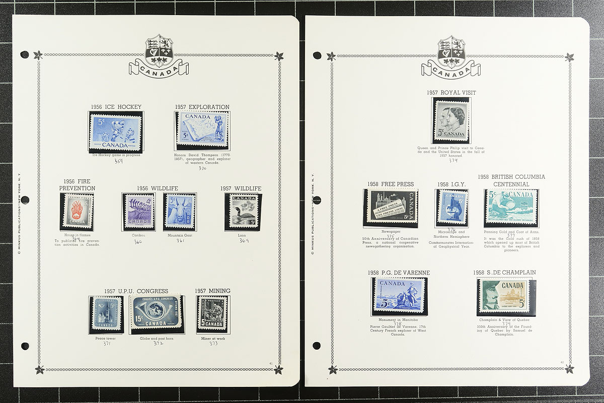 Minkus Mint Collection Part A. The run of 1859-1985, housed within a deluxe padded / illustrated green 3-ring album, with matching Minkus pages going back to 1851 and black mounts added for the stamps. Loads of value here, with primarily used earlier issues including Cents, Large Queens, Small Queens, Maps, Leafs, Numerals, Edwards, Tercentenary, Admiral and strong George V era. A bit mixed condition on the earlier material, but lots of better stamps here, expect the mint to be Hinged / Hinge Remnant, but with some Never Hinged mixed in to act as a bonus once discovered. Includes "back of the book" for the period as well. The catalogue value would likely easily encroach on $8,000-$10,000. Offered intact from a local estate. Estimate =