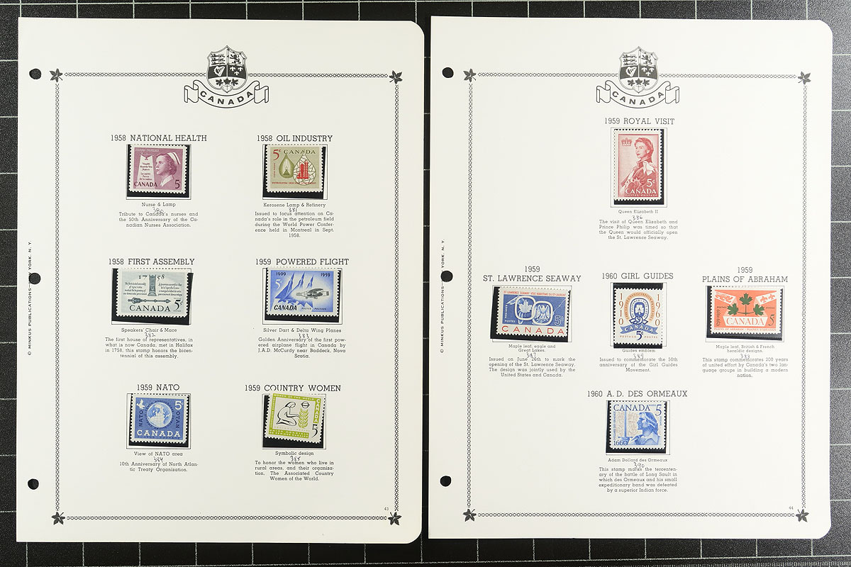 Minkus Mint Collection Part A. The run of 1859-1985, housed within a deluxe padded / illustrated green 3-ring album, with matching Minkus pages going back to 1851 and black mounts added for the stamps. Loads of value here, with primarily used earlier issues including Cents, Large Queens, Small Queens, Maps, Leafs, Numerals, Edwards, Tercentenary, Admiral and strong George V era. A bit mixed condition on the earlier material, but lots of better stamps here, expect the mint to be Hinged / Hinge Remnant, but with some Never Hinged mixed in to act as a bonus once discovered. Includes "back of the book" for the period as well. The catalogue value would likely easily encroach on $8,000-$10,000. Offered intact from a local estate. Estimate =
