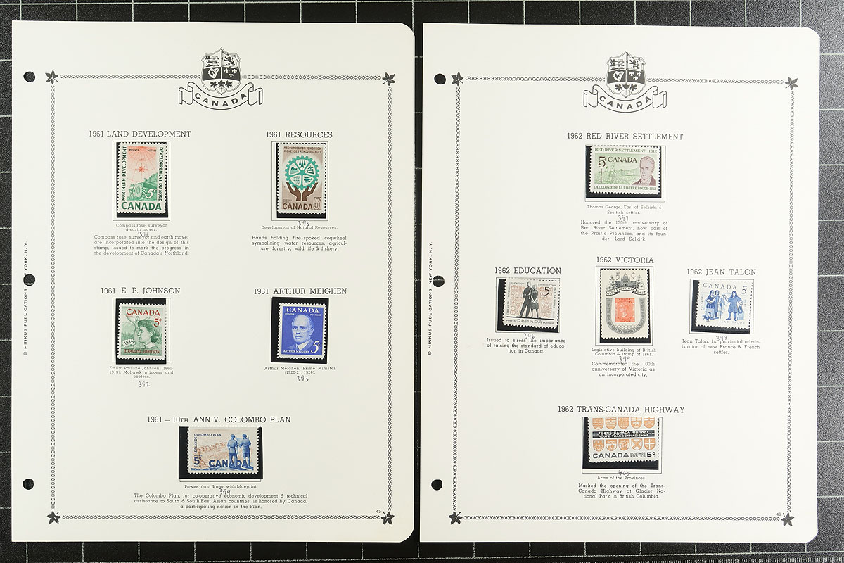 Minkus Mint Collection Part A. The run of 1859-1985, housed within a deluxe padded / illustrated green 3-ring album, with matching Minkus pages going back to 1851 and black mounts added for the stamps. Loads of value here, with primarily used earlier issues including Cents, Large Queens, Small Queens, Maps, Leafs, Numerals, Edwards, Tercentenary, Admiral and strong George V era. A bit mixed condition on the earlier material, but lots of better stamps here, expect the mint to be Hinged / Hinge Remnant, but with some Never Hinged mixed in to act as a bonus once discovered. Includes "back of the book" for the period as well. The catalogue value would likely easily encroach on $8,000-$10,000. Offered intact from a local estate. Estimate =