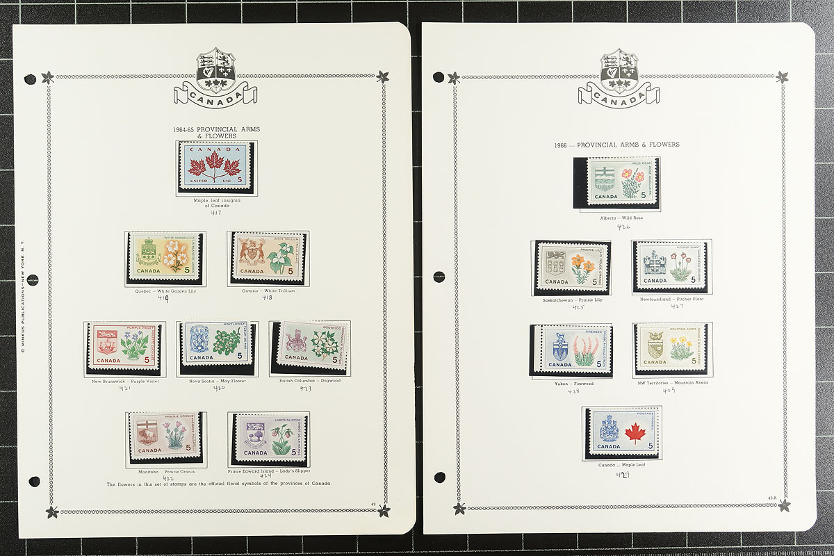 Minkus Mint Collection Part A. The run of 1859-1985, housed within a deluxe padded / illustrated green 3-ring album, with matching Minkus pages going back to 1851 and black mounts added for the stamps. Loads of value here, with primarily used earlier issues including Cents, Large Queens, Small Queens, Maps, Leafs, Numerals, Edwards, Tercentenary, Admiral and strong George V era. A bit mixed condition on the earlier material, but lots of better stamps here, expect the mint to be Hinged / Hinge Remnant, but with some Never Hinged mixed in to act as a bonus once discovered. Includes "back of the book" for the period as well. The catalogue value would likely easily encroach on $8,000-$10,000. Offered intact from a local estate. Estimate =