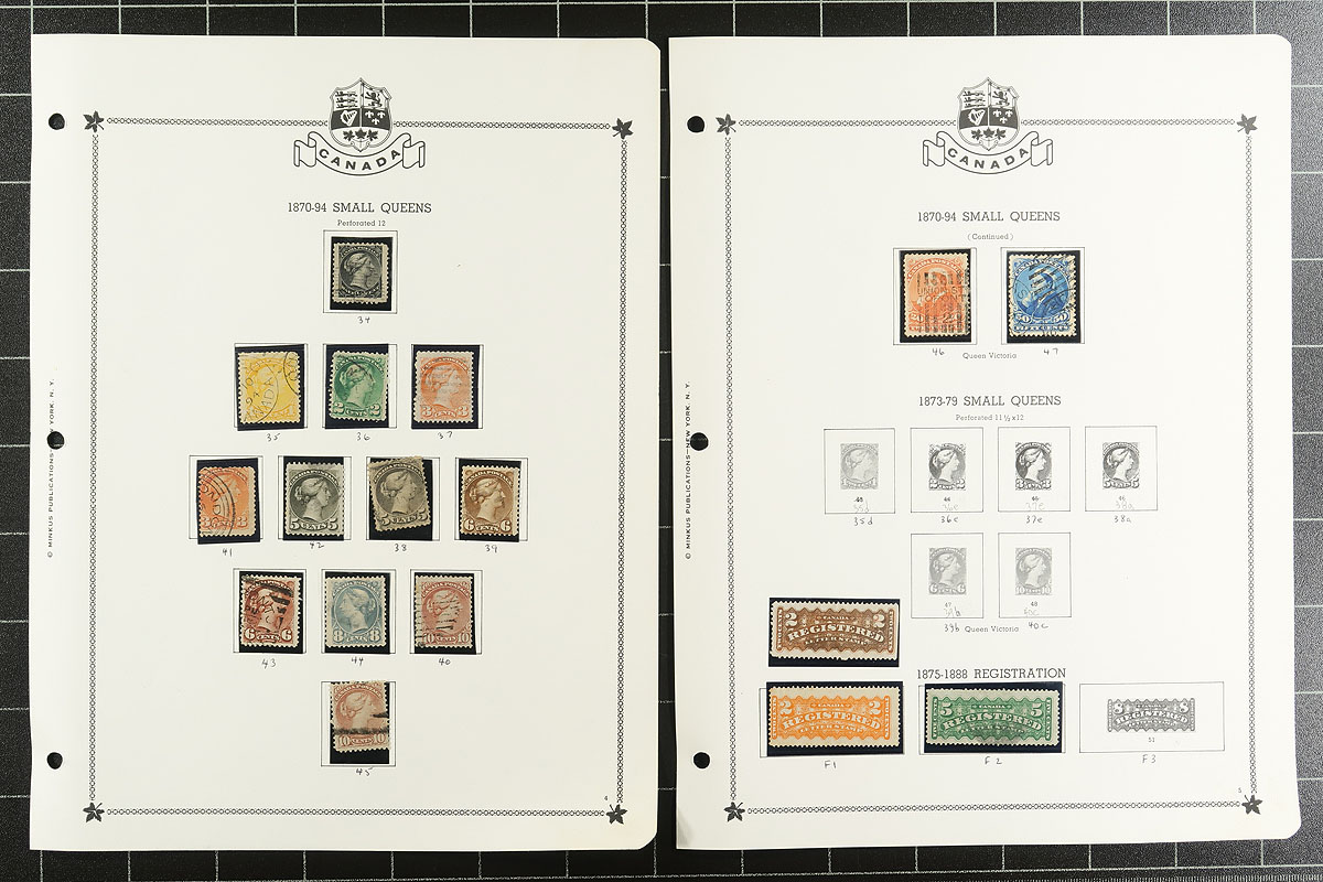 Minkus Mint Collection Part A. The run of 1859-1985, housed within a deluxe padded / illustrated green 3-ring album, with matching Minkus pages going back to 1851 and black mounts added for the stamps. Loads of value here, with primarily used earlier issues including Cents, Large Queens, Small Queens, Maps, Leafs, Numerals, Edwards, Tercentenary, Admiral and strong George V era. A bit mixed condition on the earlier material, but lots of better stamps here, expect the mint to be Hinged / Hinge Remnant, but with some Never Hinged mixed in to act as a bonus once discovered. Includes "back of the book" for the period as well. The catalogue value would likely easily encroach on $8,000-$10,000. Offered intact from a local estate. Estimate =