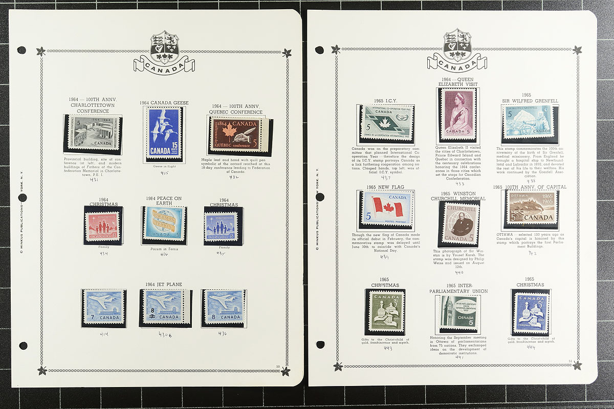 Minkus Mint Collection Part A. The run of 1859-1985, housed within a deluxe padded / illustrated green 3-ring album, with matching Minkus pages going back to 1851 and black mounts added for the stamps. Loads of value here, with primarily used earlier issues including Cents, Large Queens, Small Queens, Maps, Leafs, Numerals, Edwards, Tercentenary, Admiral and strong George V era. A bit mixed condition on the earlier material, but lots of better stamps here, expect the mint to be Hinged / Hinge Remnant, but with some Never Hinged mixed in to act as a bonus once discovered. Includes "back of the book" for the period as well. The catalogue value would likely easily encroach on $8,000-$10,000. Offered intact from a local estate. Estimate =