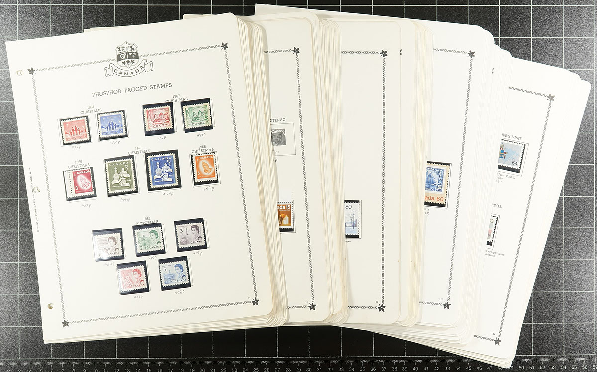 Minkus Mint Collection Part A. The run of 1859-1985, housed within a deluxe padded / illustrated green 3-ring album, with matching Minkus pages going back to 1851 and black mounts added for the stamps. Loads of value here, with primarily used earlier issues including Cents, Large Queens, Small Queens, Maps, Leafs, Numerals, Edwards, Tercentenary, Admiral and strong George V era. A bit mixed condition on the earlier material, but lots of better stamps here, expect the mint to be Hinged / Hinge Remnant, but with some Never Hinged mixed in to act as a bonus once discovered. Includes "back of the book" for the period as well. The catalogue value would likely easily encroach on $8,000-$10,000. Offered intact from a local estate. Estimate =