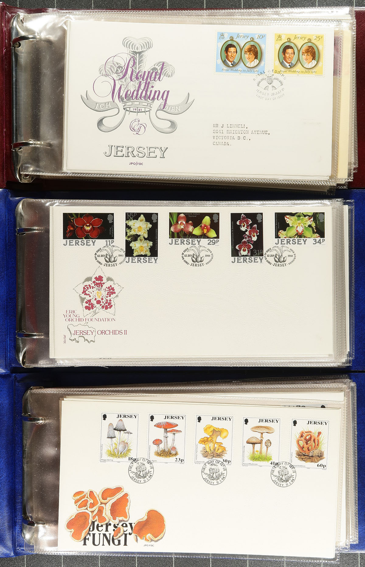 Attractive collection of Jersey first day covers, 1970's-1990's, containing roughly 250 FDC in 3 cover albums and loose material. The collection generally ranges from Scott #73/961 noting singles, souvenir sheets, and several set frankings, including roughly 50 "Colorado Silk" first day covers. A nice lot for topical and thematic collectors as we encountered many suitable subjects including nature, sports, butterflies, transportation, and more. A nice clean lot with several colourful cachets, overall very fine. Estimate =