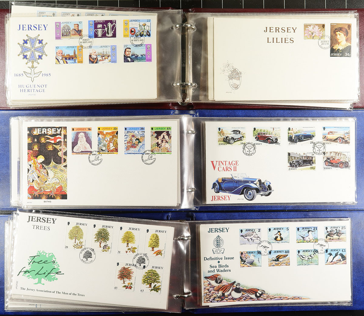 Attractive collection of Jersey first day covers, 1970's-1990's, containing roughly 250 FDC in 3 cover albums and loose material. The collection generally ranges from Scott #73/961 noting singles, souvenir sheets, and several set frankings, including roughly 50 "Colorado Silk" first day covers. A nice lot for topical and thematic collectors as we encountered many suitable subjects including nature, sports, butterflies, transportation, and more. A nice clean lot with several colourful cachets, overall very fine. Estimate =