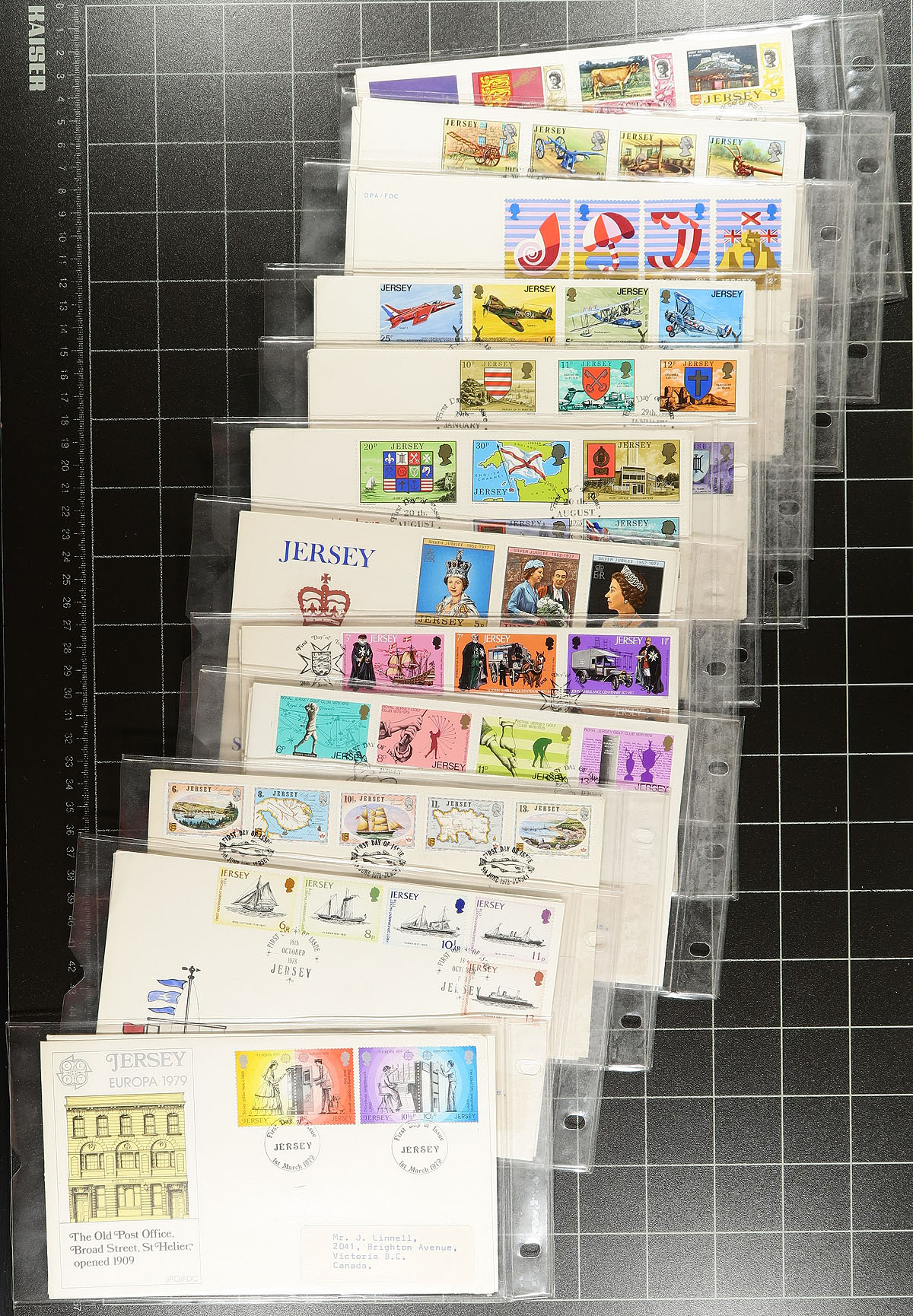 Attractive collection of Jersey first day covers, 1970's-1990's, containing roughly 250 FDC in 3 cover albums and loose material. The collection generally ranges from Scott #73/961 noting singles, souvenir sheets, and several set frankings, including roughly 50 "Colorado Silk" first day covers. A nice lot for topical and thematic collectors as we encountered many suitable subjects including nature, sports, butterflies, transportation, and more. A nice clean lot with several colourful cachets, overall very fine. Estimate =
