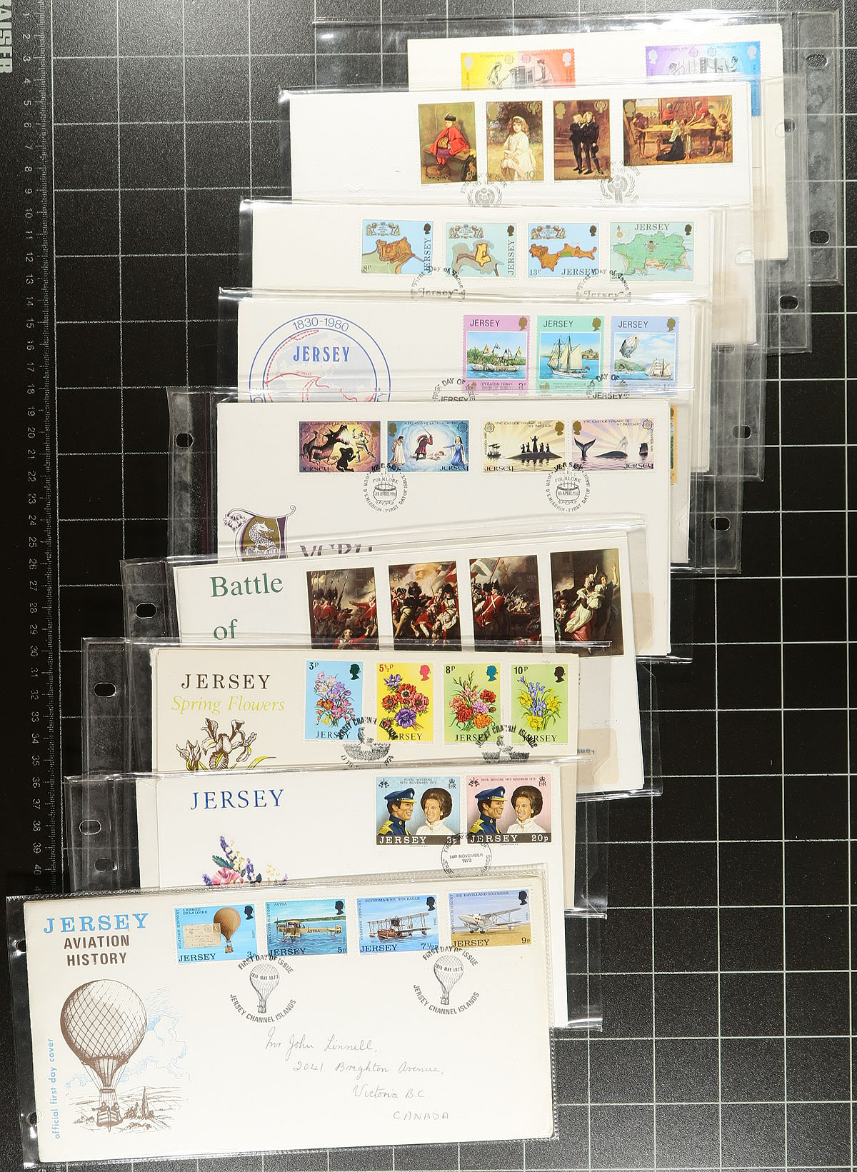 Attractive collection of Jersey first day covers, 1970's-1990's, containing roughly 250 FDC in 3 cover albums and loose material. The collection generally ranges from Scott #73/961 noting singles, souvenir sheets, and several set frankings, including roughly 50 "Colorado Silk" first day covers. A nice lot for topical and thematic collectors as we encountered many suitable subjects including nature, sports, butterflies, transportation, and more. A nice clean lot with several colourful cachets, overall very fine. Estimate =