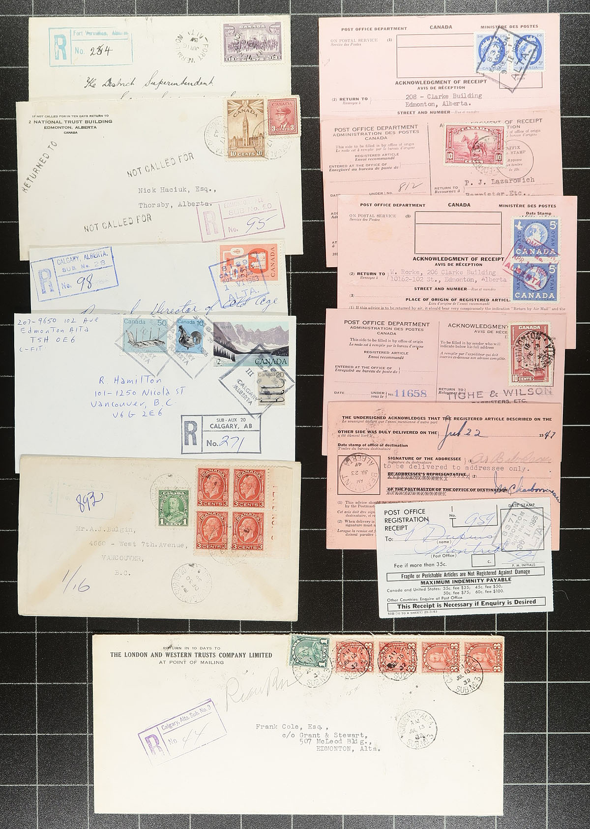 Nice used collection of Alberta town postmarks, 1910's-1990's, containing many hundreds of stamps (many on piece), and roughly 150 covers on hundreds of described pages in 4 binders. The collection begins with 2 binders of Edmonton sub-office postmarks, containing roughly 70 different ranging from 1/139, a binder of Calgary sub offices ranging from 1/59, and a 4th binder of larger town sub offices including Red Deer, Fort McMurray and more. We note a wide variety of postmarks including CDS, split ring, MOON, POCON, MOOD, and other types, including AR cards, registered letters, special delivery, and much more. A very nice lot for the Alberta postmark hunter, overall fine to very fine. Estimate =