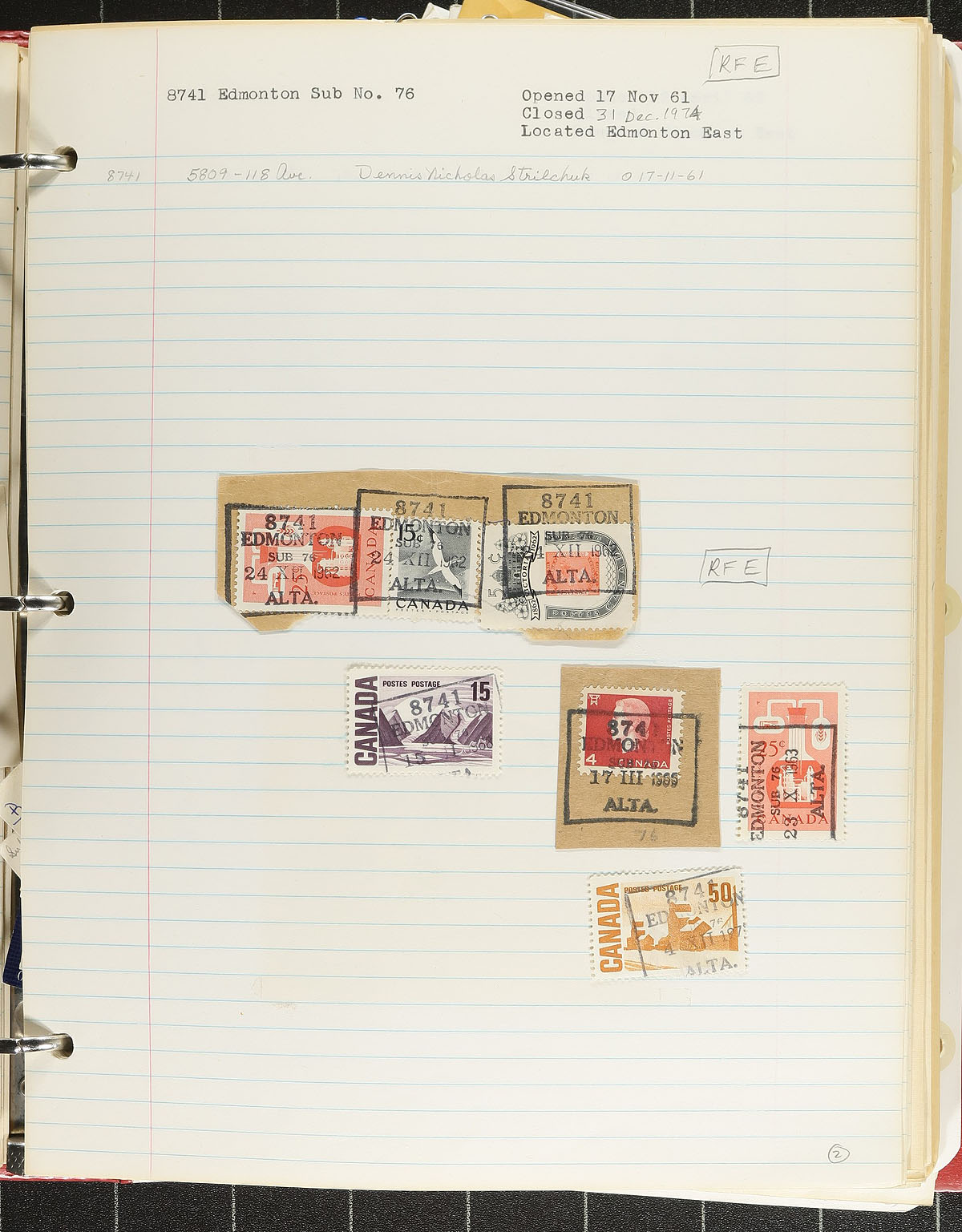 Nice used collection of Alberta town postmarks, 1910's-1990's, containing many hundreds of stamps (many on piece), and roughly 150 covers on hundreds of described pages in 4 binders. The collection begins with 2 binders of Edmonton sub-office postmarks, containing roughly 70 different ranging from 1/139, a binder of Calgary sub offices ranging from 1/59, and a 4th binder of larger town sub offices including Red Deer, Fort McMurray and more. We note a wide variety of postmarks including CDS, split ring, MOON, POCON, MOOD, and other types, including AR cards, registered letters, special delivery, and much more. A very nice lot for the Alberta postmark hunter, overall fine to very fine. Estimate =