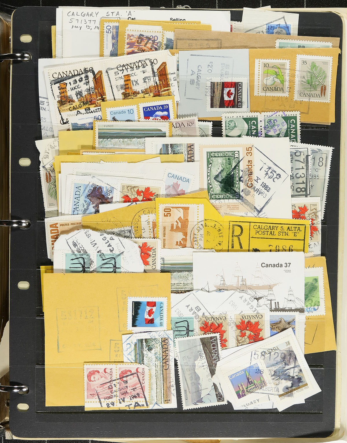 Nice used collection of Alberta town postmarks, 1910's-1990's, containing many hundreds of stamps (many on piece), and roughly 150 covers on hundreds of described pages in 4 binders. The collection begins with 2 binders of Edmonton sub-office postmarks, containing roughly 70 different ranging from 1/139, a binder of Calgary sub offices ranging from 1/59, and a 4th binder of larger town sub offices including Red Deer, Fort McMurray and more. We note a wide variety of postmarks including CDS, split ring, MOON, POCON, MOOD, and other types, including AR cards, registered letters, special delivery, and much more. A very nice lot for the Alberta postmark hunter, overall fine to very fine. Estimate =