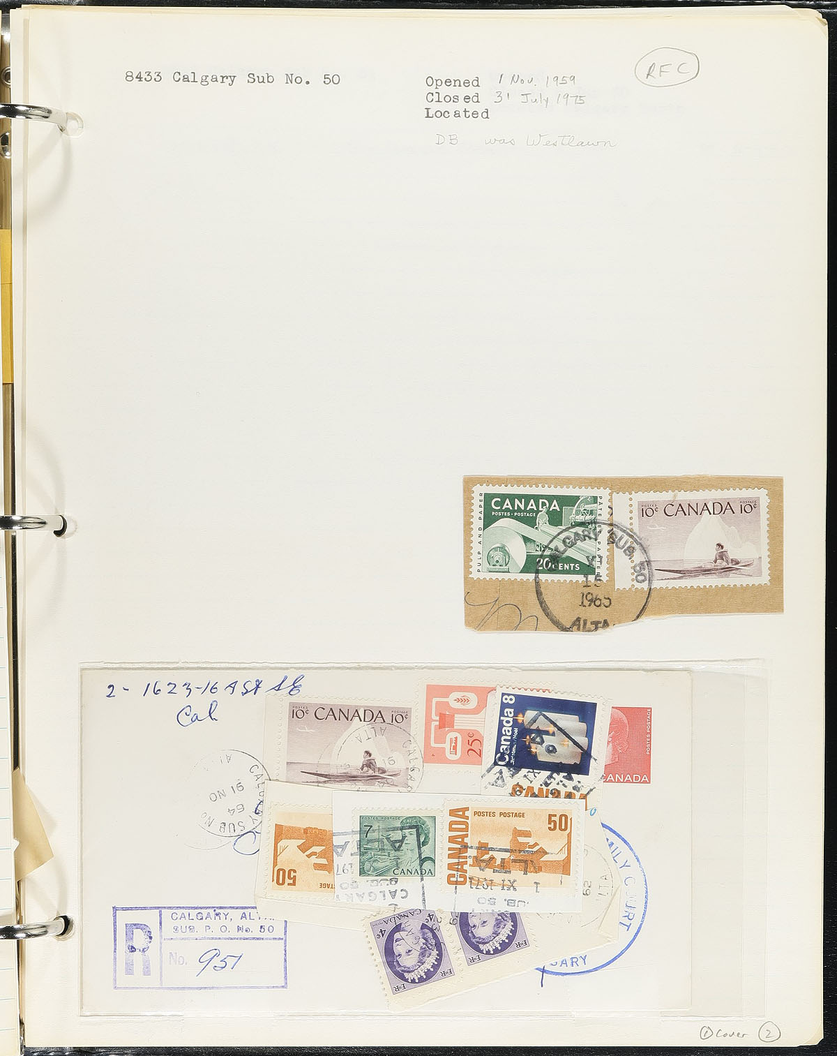 Nice used collection of Alberta town postmarks, 1910's-1990's, containing many hundreds of stamps (many on piece), and roughly 150 covers on hundreds of described pages in 4 binders. The collection begins with 2 binders of Edmonton sub-office postmarks, containing roughly 70 different ranging from 1/139, a binder of Calgary sub offices ranging from 1/59, and a 4th binder of larger town sub offices including Red Deer, Fort McMurray and more. We note a wide variety of postmarks including CDS, split ring, MOON, POCON, MOOD, and other types, including AR cards, registered letters, special delivery, and much more. A very nice lot for the Alberta postmark hunter, overall fine to very fine. Estimate =