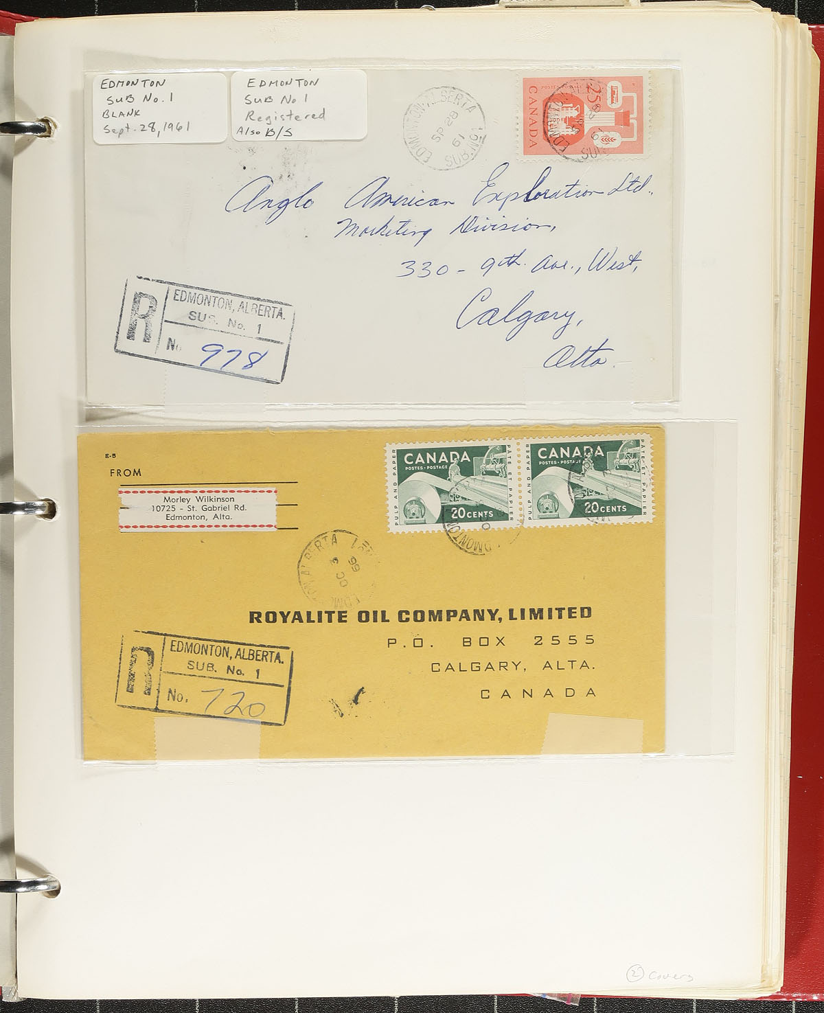 Nice used collection of Alberta town postmarks, 1910's-1990's, containing many hundreds of stamps (many on piece), and roughly 150 covers on hundreds of described pages in 4 binders. The collection begins with 2 binders of Edmonton sub-office postmarks, containing roughly 70 different ranging from 1/139, a binder of Calgary sub offices ranging from 1/59, and a 4th binder of larger town sub offices including Red Deer, Fort McMurray and more. We note a wide variety of postmarks including CDS, split ring, MOON, POCON, MOOD, and other types, including AR cards, registered letters, special delivery, and much more. A very nice lot for the Alberta postmark hunter, overall fine to very fine. Estimate =