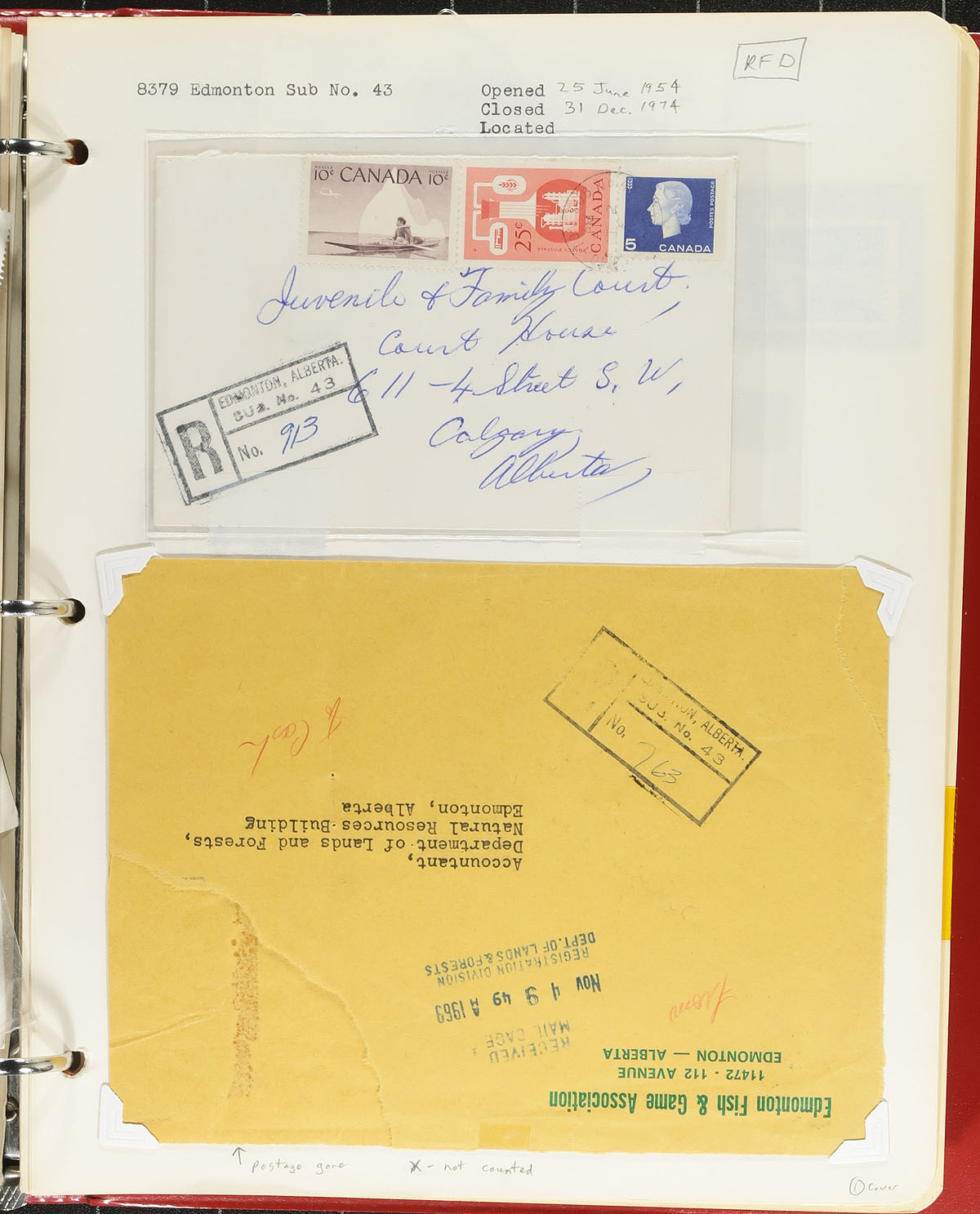 Nice used collection of Alberta town postmarks, 1910's-1990's, containing many hundreds of stamps (many on piece), and roughly 150 covers on hundreds of described pages in 4 binders. The collection begins with 2 binders of Edmonton sub-office postmarks, containing roughly 70 different ranging from 1/139, a binder of Calgary sub offices ranging from 1/59, and a 4th binder of larger town sub offices including Red Deer, Fort McMurray and more. We note a wide variety of postmarks including CDS, split ring, MOON, POCON, MOOD, and other types, including AR cards, registered letters, special delivery, and much more. A very nice lot for the Alberta postmark hunter, overall fine to very fine. Estimate =