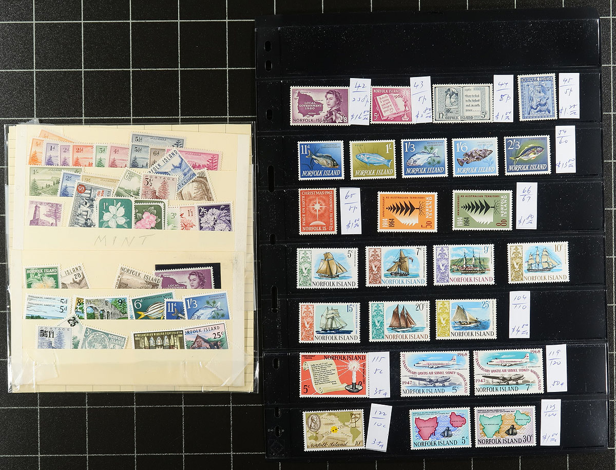 Collection / accumulation of primarily mint Norfolk Islands, 1947-1994, containing several hundreds of stamps on roughly 12 album or stock pages. The collection generally ranges from Scott #1/550, noting several sets, blocks, a few souvenir sheets, with some material cataloguing $10 and up. Owner's 2015 Scott catalogue value for the lot totals US$665.00 ($897.75 CDN). Mild duplication throughout, up to 3 for some issues. A nice lot for the Commonwealth collector, also encountering several suitable topical and thematic subjects, overall fine to very fine. Estimate =