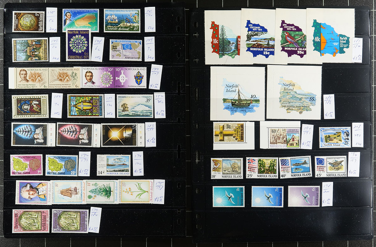 Collection / accumulation of primarily mint Norfolk Islands, 1947-1994, containing several hundreds of stamps on roughly 12 album or stock pages. The collection generally ranges from Scott #1/550, noting several sets, blocks, a few souvenir sheets, with some material cataloguing $10 and up. Owner's 2015 Scott catalogue value for the lot totals US$665.00 ($897.75 CDN). Mild duplication throughout, up to 3 for some issues. A nice lot for the Commonwealth collector, also encountering several suitable topical and thematic subjects, overall fine to very fine. Estimate =