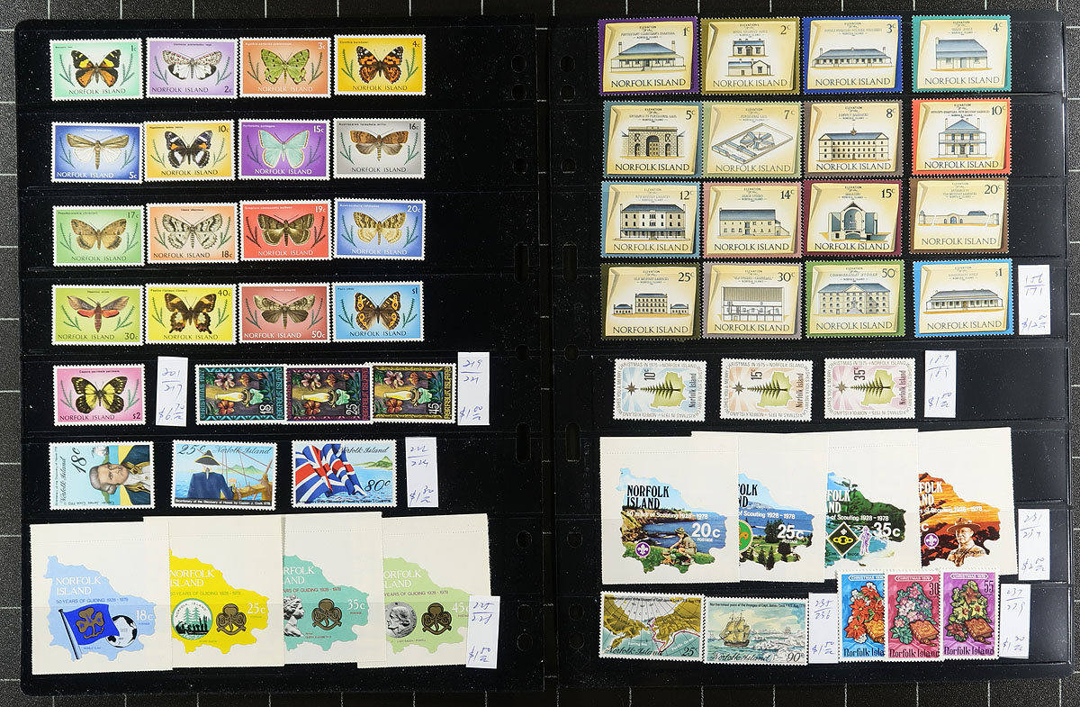Collection / accumulation of primarily mint Norfolk Islands, 1947-1994, containing several hundreds of stamps on roughly 12 album or stock pages. The collection generally ranges from Scott #1/550, noting several sets, blocks, a few souvenir sheets, with some material cataloguing $10 and up. Owner's 2015 Scott catalogue value for the lot totals US$665.00 ($897.75 CDN). Mild duplication throughout, up to 3 for some issues. A nice lot for the Commonwealth collector, also encountering several suitable topical and thematic subjects, overall fine to very fine. Estimate =
