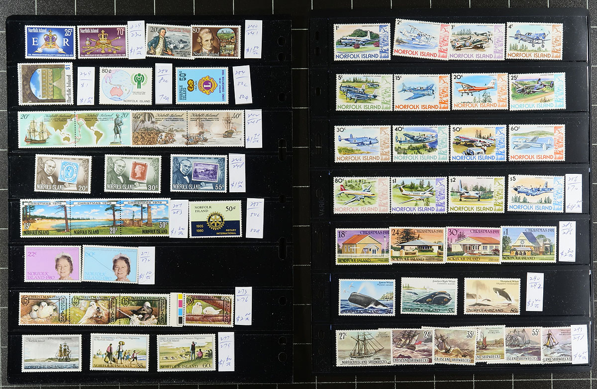 Collection / accumulation of primarily mint Norfolk Islands, 1947-1994, containing several hundreds of stamps on roughly 12 album or stock pages. The collection generally ranges from Scott #1/550, noting several sets, blocks, a few souvenir sheets, with some material cataloguing $10 and up. Owner's 2015 Scott catalogue value for the lot totals US$665.00 ($897.75 CDN). Mild duplication throughout, up to 3 for some issues. A nice lot for the Commonwealth collector, also encountering several suitable topical and thematic subjects, overall fine to very fine. Estimate =