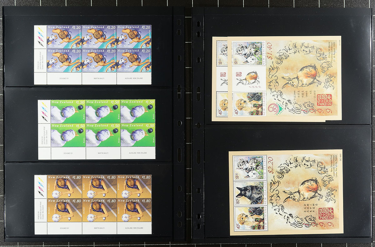 Collection of mint and used New Zealand souvenir sheets and blocks, 1960's-2003, containing a few hundred items in over 15 stock pages. The lot contains roughly 60, primarily mint never hinged souvenir sheets, including mint and used Health sheets, along with more modern plate blocks from the 1990's, noting items cataloguing in the $10 to $15 range. Owners 2012 Scott catalogue value for the lot totals US$672.00 ($907.20 CDN). A nice lot with several topical and thematic possibilities, overall fine to very fine. Estimate =