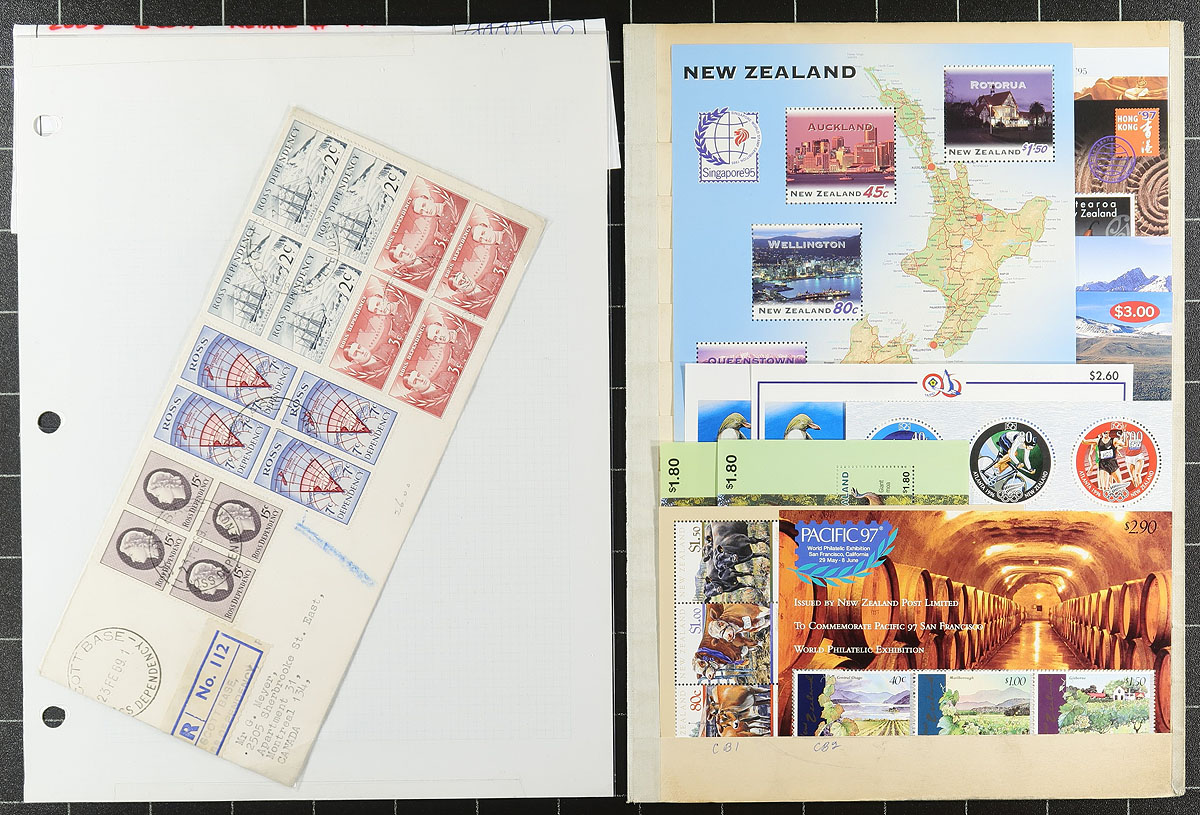 Collection of mint and used New Zealand souvenir sheets and blocks, 1960's-2003, containing a few hundred items in over 15 stock pages. The lot contains roughly 60, primarily mint never hinged souvenir sheets, including mint and used Health sheets, along with more modern plate blocks from the 1990's, noting items cataloguing in the $10 to $15 range. Owners 2012 Scott catalogue value for the lot totals US$672.00 ($907.20 CDN). A nice lot with several topical and thematic possibilities, overall fine to very fine. Estimate =