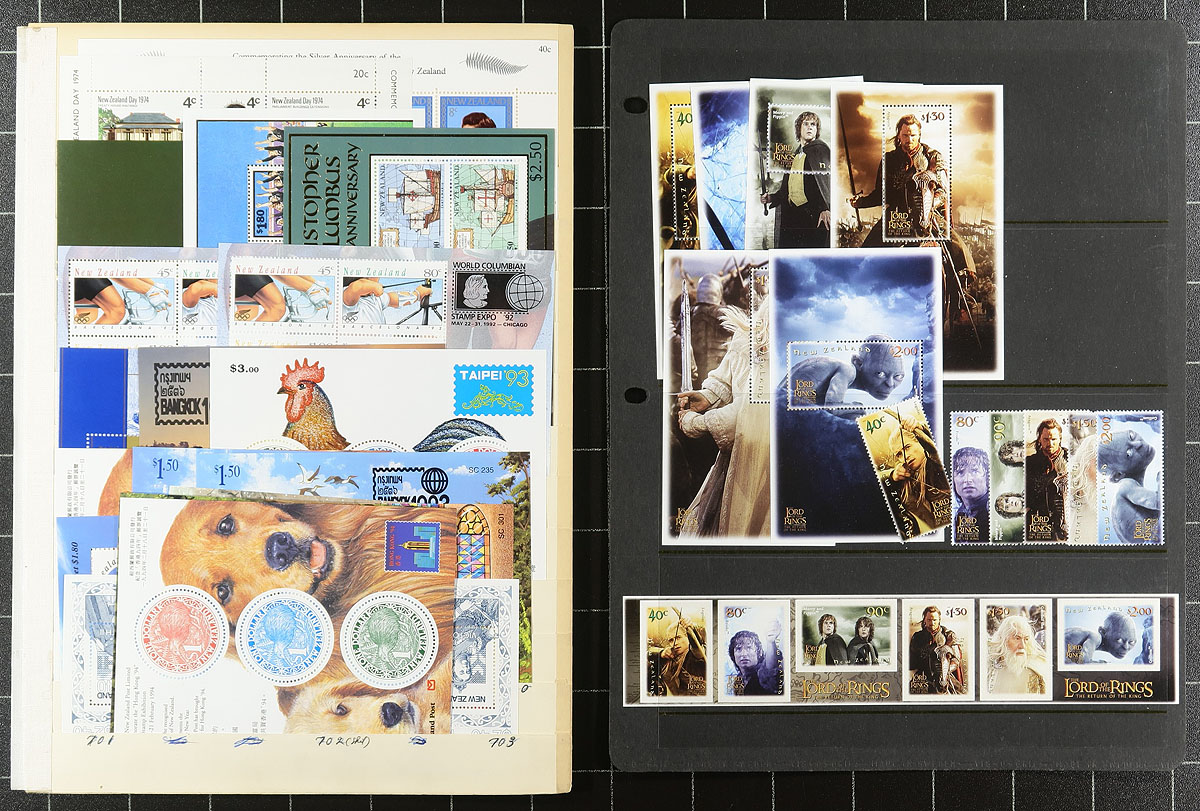 Collection of mint and used New Zealand souvenir sheets and blocks, 1960's-2003, containing a few hundred items in over 15 stock pages. The lot contains roughly 60, primarily mint never hinged souvenir sheets, including mint and used Health sheets, along with more modern plate blocks from the 1990's, noting items cataloguing in the $10 to $15 range. Owners 2012 Scott catalogue value for the lot totals US$672.00 ($907.20 CDN). A nice lot with several topical and thematic possibilities, overall fine to very fine. Estimate =