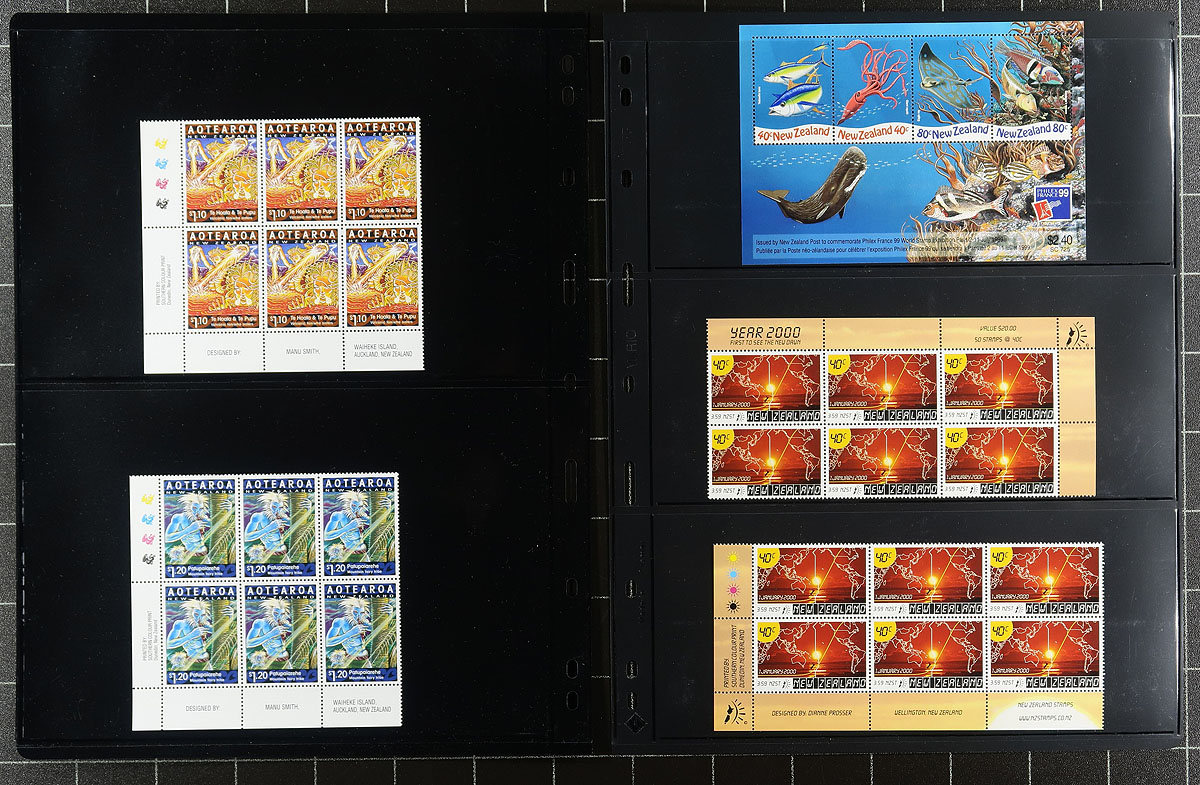 Collection of mint and used New Zealand souvenir sheets and blocks, 1960's-2003, containing a few hundred items in over 15 stock pages. The lot contains roughly 60, primarily mint never hinged souvenir sheets, including mint and used Health sheets, along with more modern plate blocks from the 1990's, noting items cataloguing in the $10 to $15 range. Owners 2012 Scott catalogue value for the lot totals US$672.00 ($907.20 CDN). A nice lot with several topical and thematic possibilities, overall fine to very fine. Estimate =