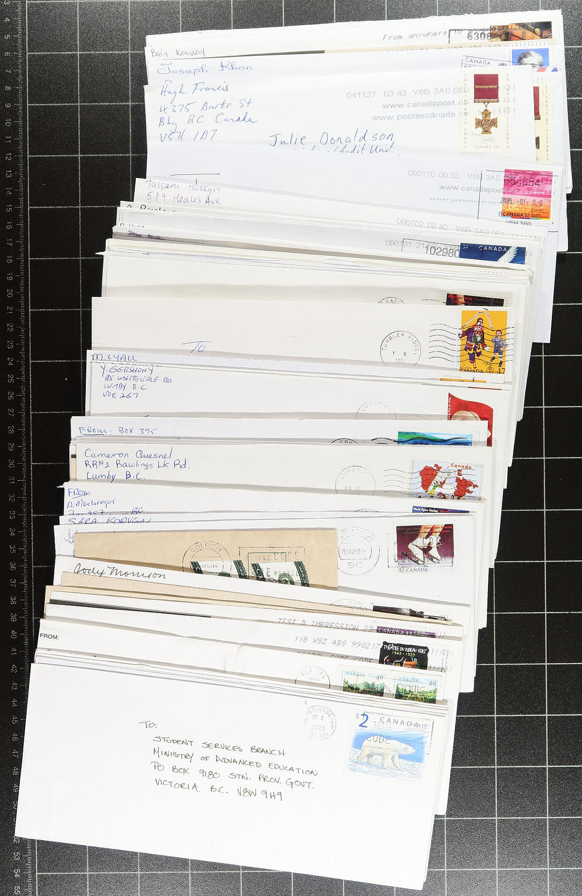 British Columbia Postal History. Accumulation of roughly 400 covers collected for BC postmarks, 1990's-2010, all #10 sized commercial envelopes (many having corner advertising), with almost all having single commemorative frankings. A spot check indicated towns ranging from B to W, noting POCONS, spray on, cds, Klussendorf, and surely other postmark types. A nice lot, especially postmark hunters, along with used collectors looking for more modern used material. Estimate =
