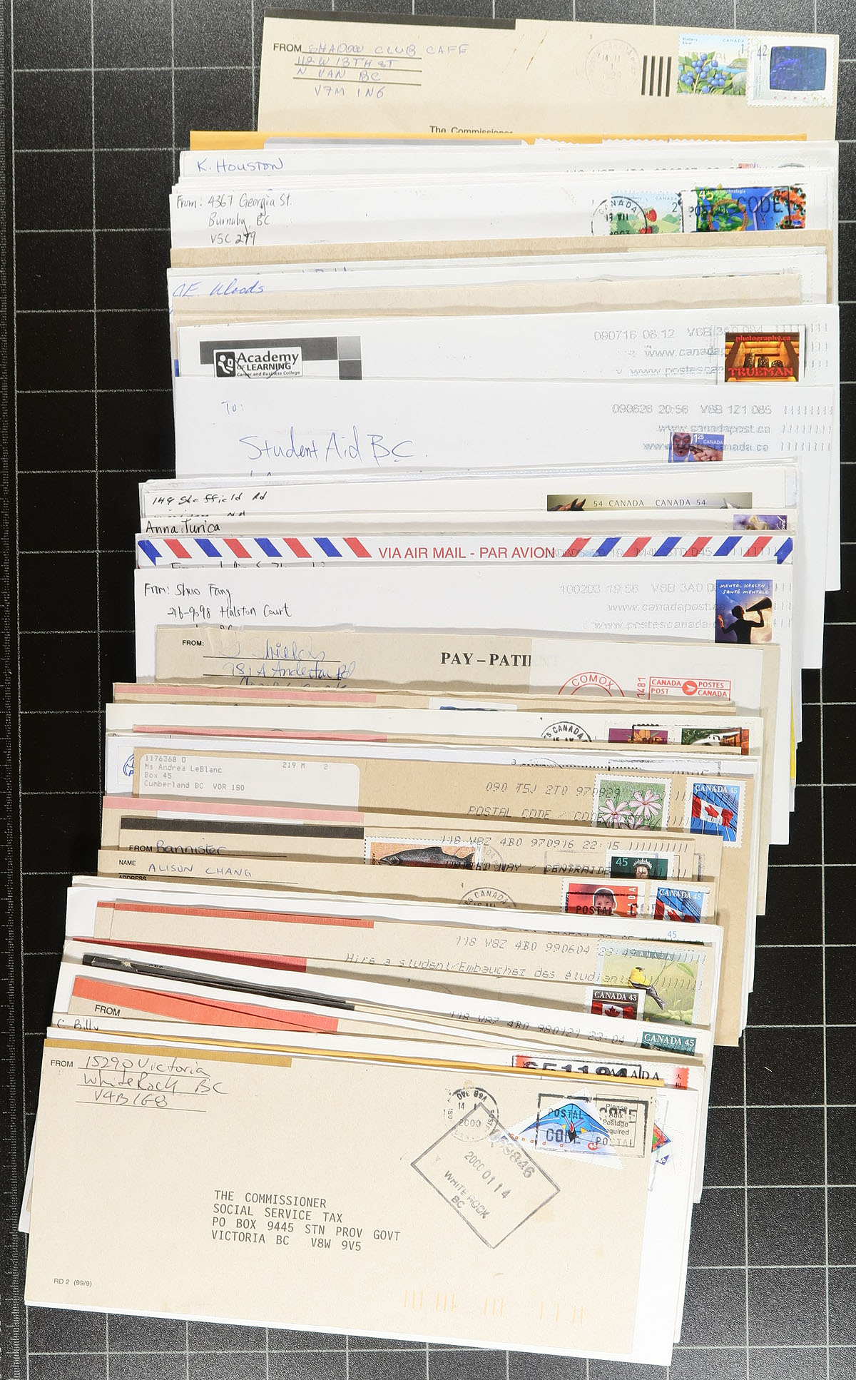 British Columbia Postal History. Accumulation of roughly 400 covers collected for BC postmarks, 1990's-2010, all #10 sized commercial envelopes (many having corner advertising), with almost all having single commemorative frankings. A spot check indicated towns ranging from B to W, noting POCONS, spray on, cds, Klussendorf, and surely other postmark types. A nice lot, especially postmark hunters, along with used collectors looking for more modern used material. Estimate =