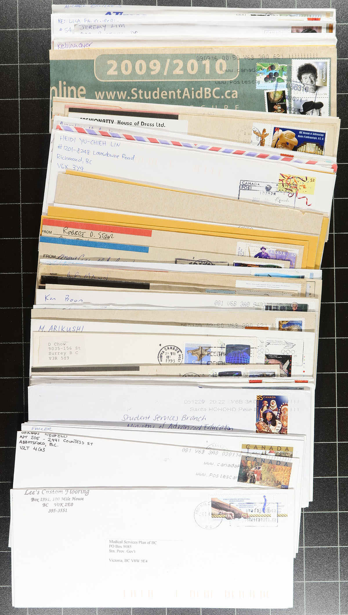 British Columbia Postal History. Accumulation of roughly 400 covers collected for BC postmarks, 1990's-2010, all #10 sized commercial envelopes (many having corner advertising), with almost all having single commemorative frankings. A spot check indicated towns ranging from B to W, noting POCONS, spray on, cds, Klussendorf, and surely other postmark types. A nice lot, especially postmark hunters, along with used collectors looking for more modern used material. Estimate =
