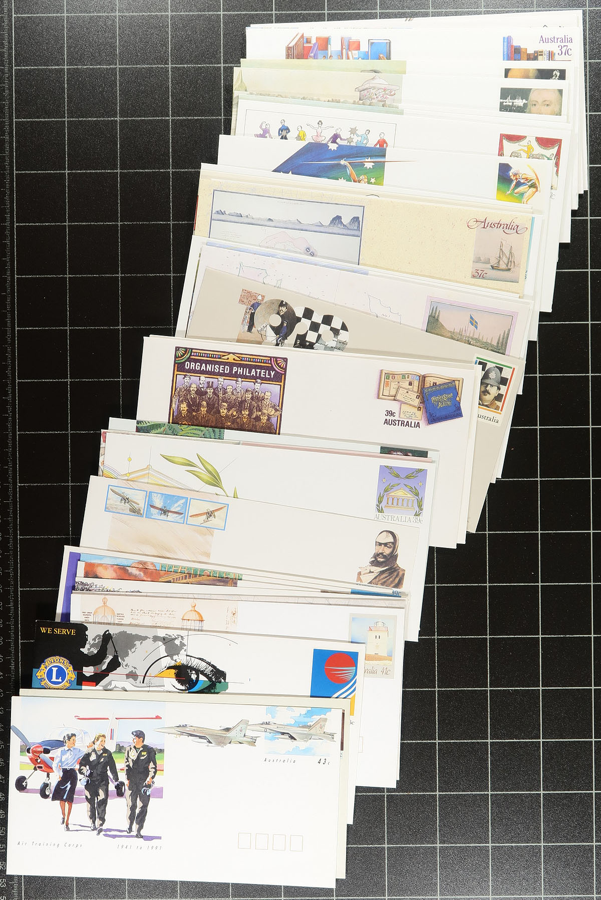 Postal Stationery. Clean collection of mint Australia postal stationery, 1980's-1990's, containing roughly 210 items, with most having colourful cachets, along with a few postage paid envelopes, aerogrammes, postal cards, etc., along with a few having first day cancels. A nice clean lot, with face value alone over $100. Very fine. Estimate =