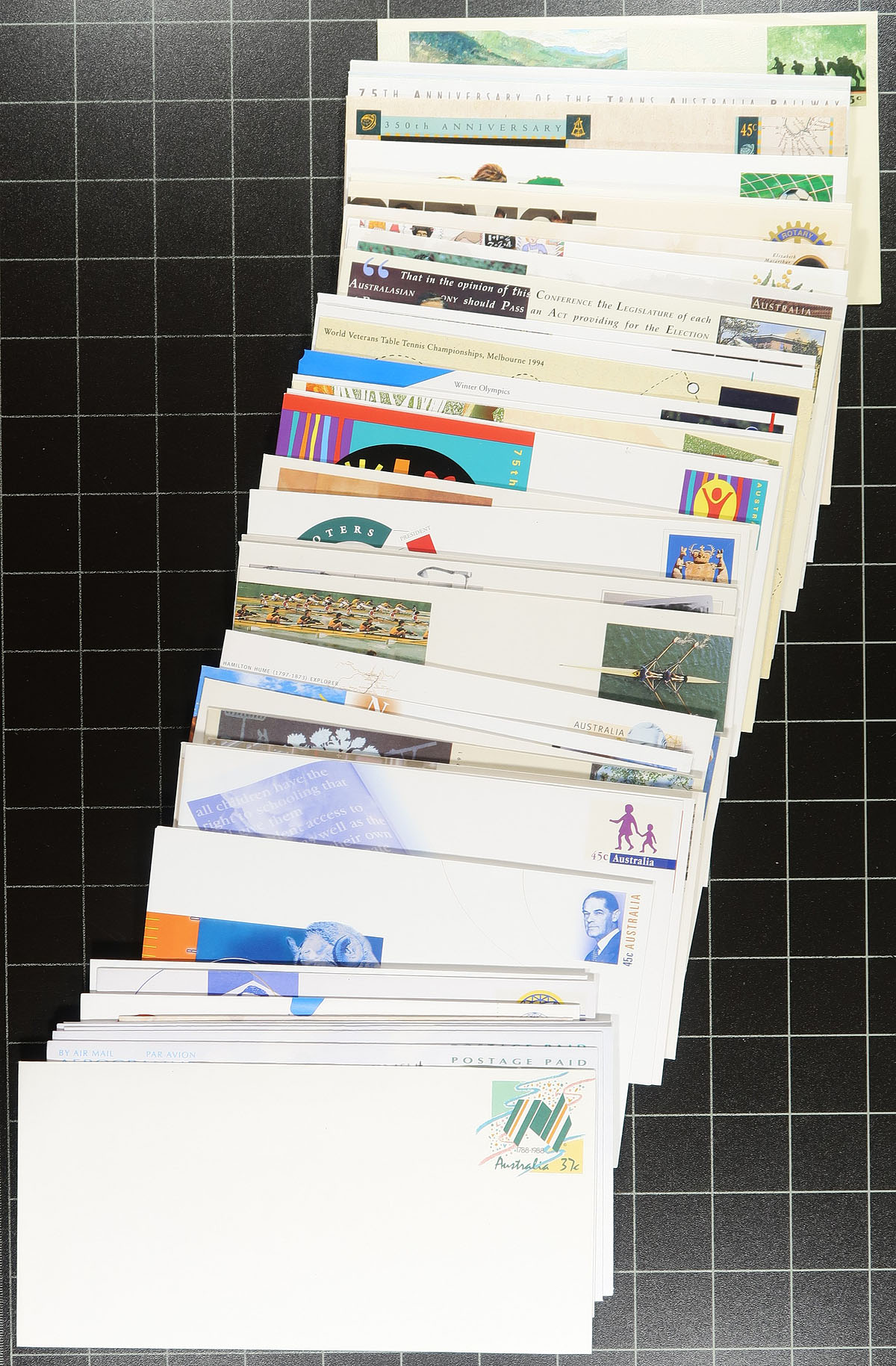 Postal Stationery. Clean collection of mint Australia postal stationery, 1980's-1990's, containing roughly 210 items, with most having colourful cachets, along with a few postage paid envelopes, aerogrammes, postal cards, etc., along with a few having first day cancels. A nice clean lot, with face value alone over $100. Very fine. Estimate =