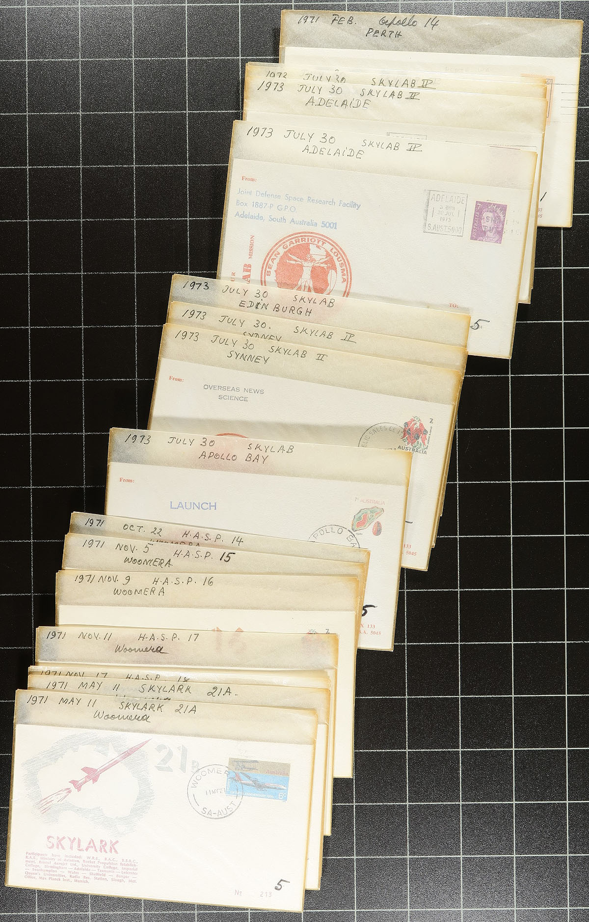 Space Covers. Lovely collection of Space related covers from Australia, 1970-1973, containing roughly 250 covers, all with space related cachets including various Apollo, Skylab, Skylark, and other missions. We note a variety of postmarks, frankings (including some from Australian Antarctic Territories), along with various radio station or other markings. A lovely lot for the topical, thematic, or astrophilately collectors, with duplication ranging 1 to 2 for some covers. Estimate =
