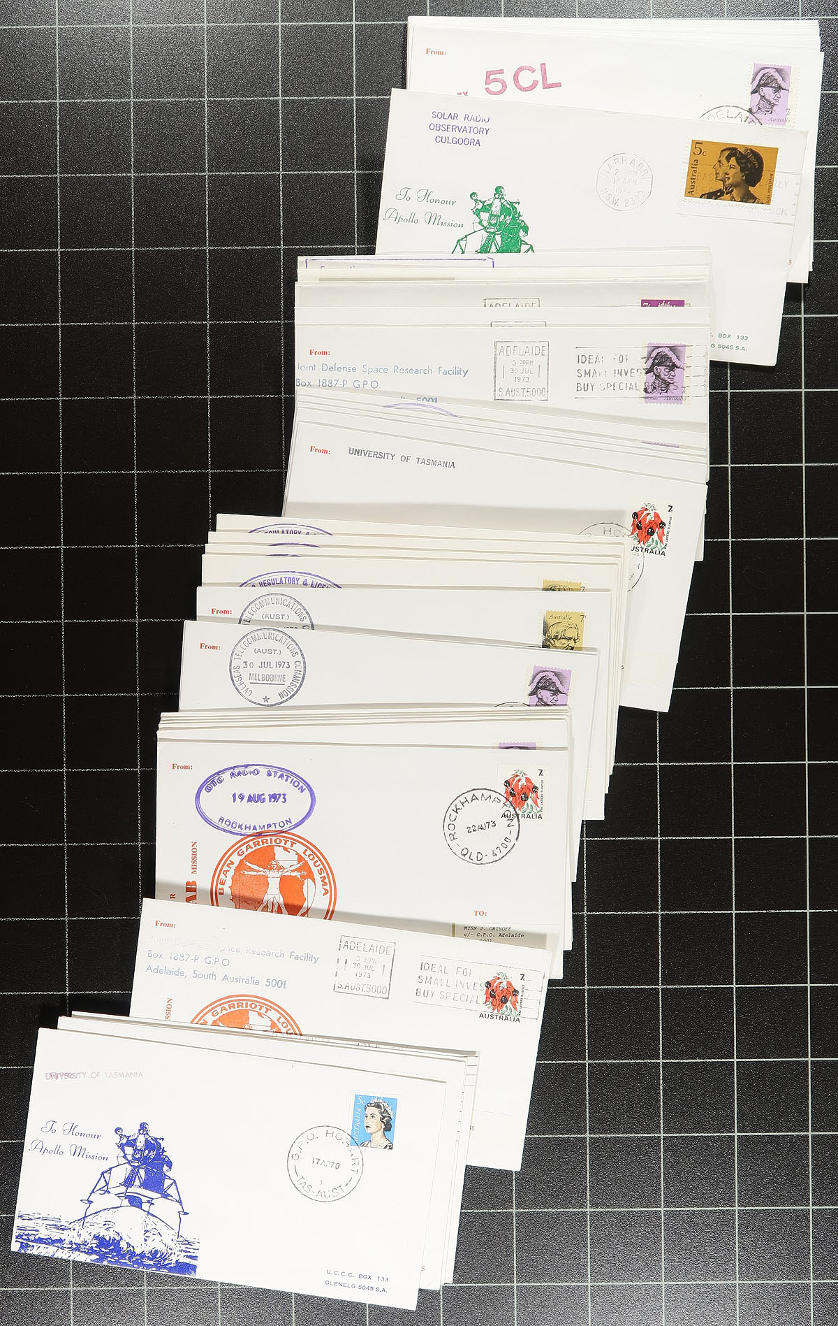 Space Covers. Lovely collection of Space related covers from Australia, 1970-1973, containing roughly 250 covers, all with space related cachets including various Apollo, Skylab, Skylark, and other missions. We note a variety of postmarks, frankings (including some from Australian Antarctic Territories), along with various radio station or other markings. A lovely lot for the topical, thematic, or astrophilately collectors, with duplication ranging 1 to 2 for some covers. Estimate =