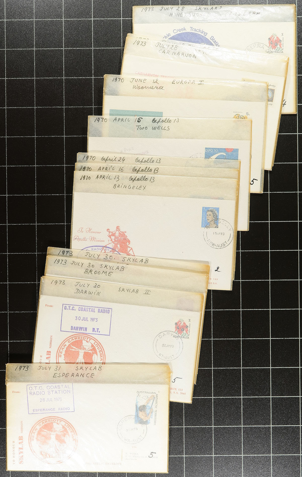 Space Covers. Lovely collection of Space related covers from Australia, 1970-1973, containing roughly 250 covers, all with space related cachets including various Apollo, Skylab, Skylark, and other missions. We note a variety of postmarks, frankings (including some from Australian Antarctic Territories), along with various radio station or other markings. A lovely lot for the topical, thematic, or astrophilately collectors, with duplication ranging 1 to 2 for some covers. Estimate =