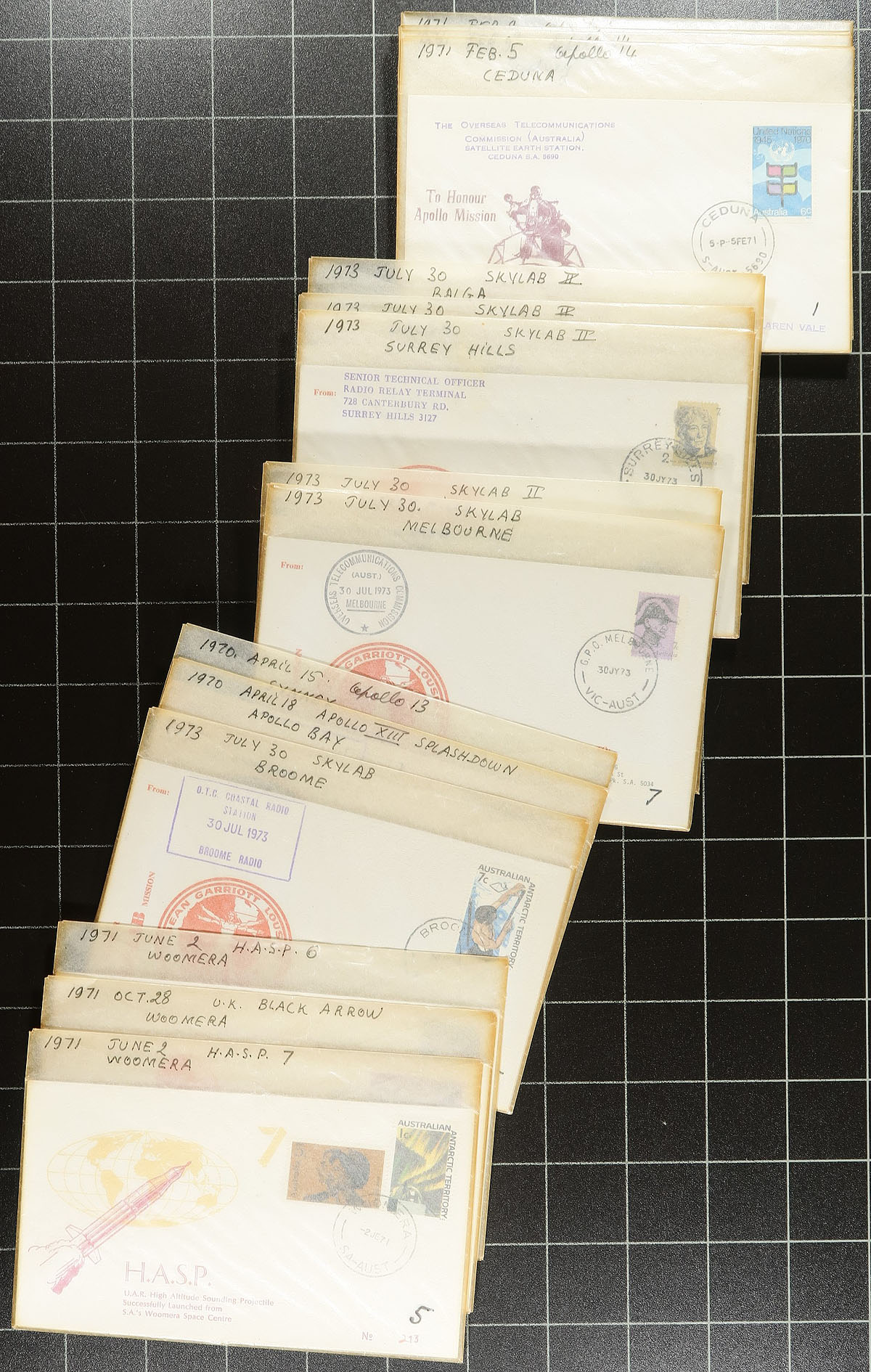 Space Covers. Lovely collection of Space related covers from Australia, 1970-1973, containing roughly 250 covers, all with space related cachets including various Apollo, Skylab, Skylark, and other missions. We note a variety of postmarks, frankings (including some from Australian Antarctic Territories), along with various radio station or other markings. A lovely lot for the topical, thematic, or astrophilately collectors, with duplication ranging 1 to 2 for some covers. Estimate =