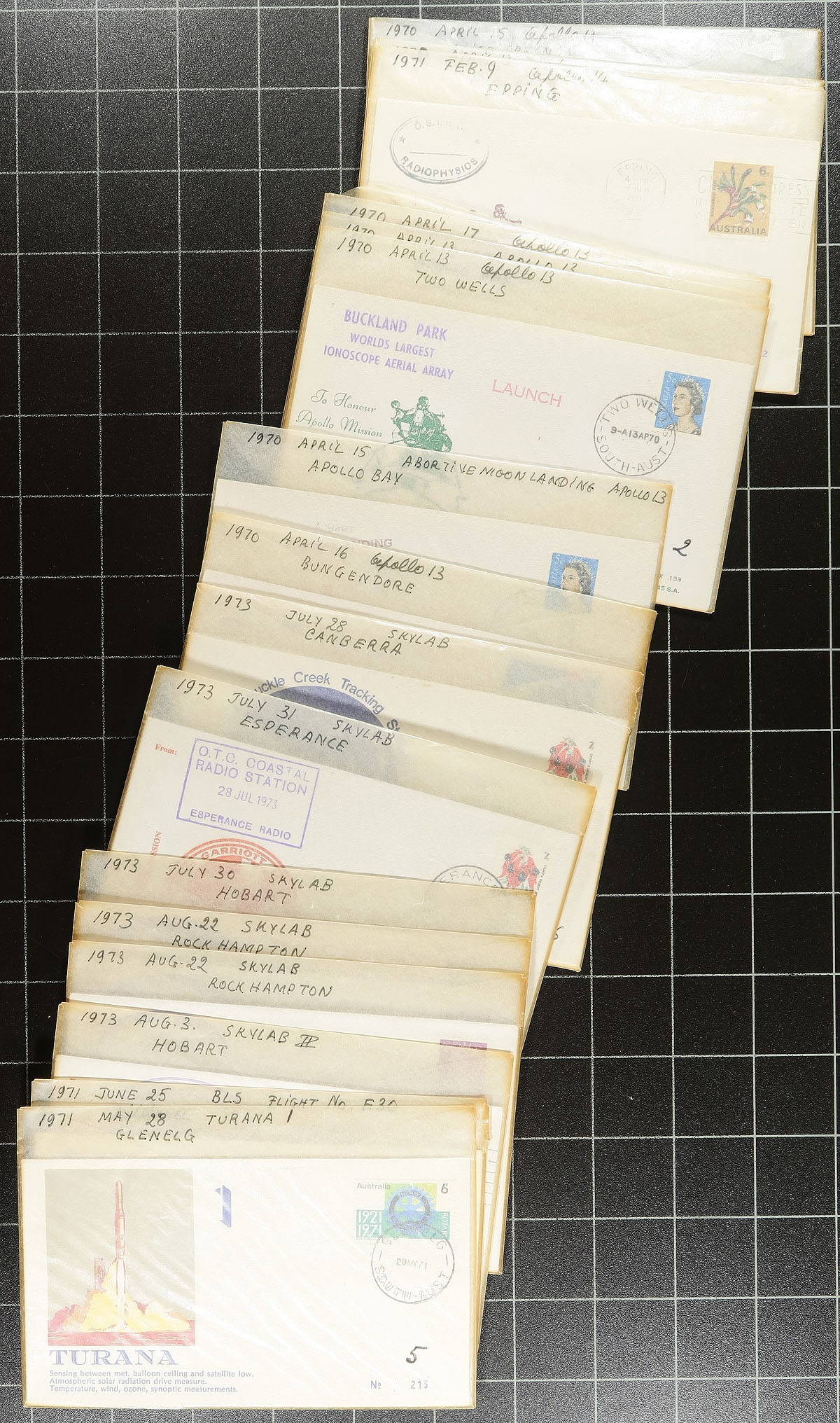 Space Covers. Lovely collection of Space related covers from Australia, 1970-1973, containing roughly 250 covers, all with space related cachets including various Apollo, Skylab, Skylark, and other missions. We note a variety of postmarks, frankings (including some from Australian Antarctic Territories), along with various radio station or other markings. A lovely lot for the topical, thematic, or astrophilately collectors, with duplication ranging 1 to 2 for some covers. Estimate =