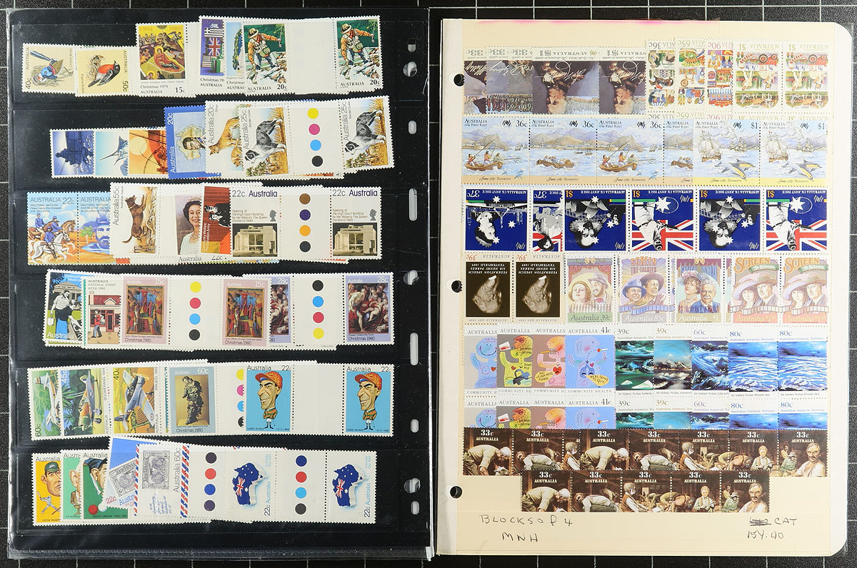 Collection of primarily never hinged Australia, 1940's-2003, containing many hundreds of stamps in over 30 album or stock pages. The collection generally ranges from Scott #252a/2158, with strength from the mid 1980's onwards, including several sets. gutter pairs, and a few souvenir sheets and panes. Face value alone would be several hundreds of dollars. A lovely lot with a variety of purposes. Very fine. Owner's older 2015 Scott US$1,059.00 =