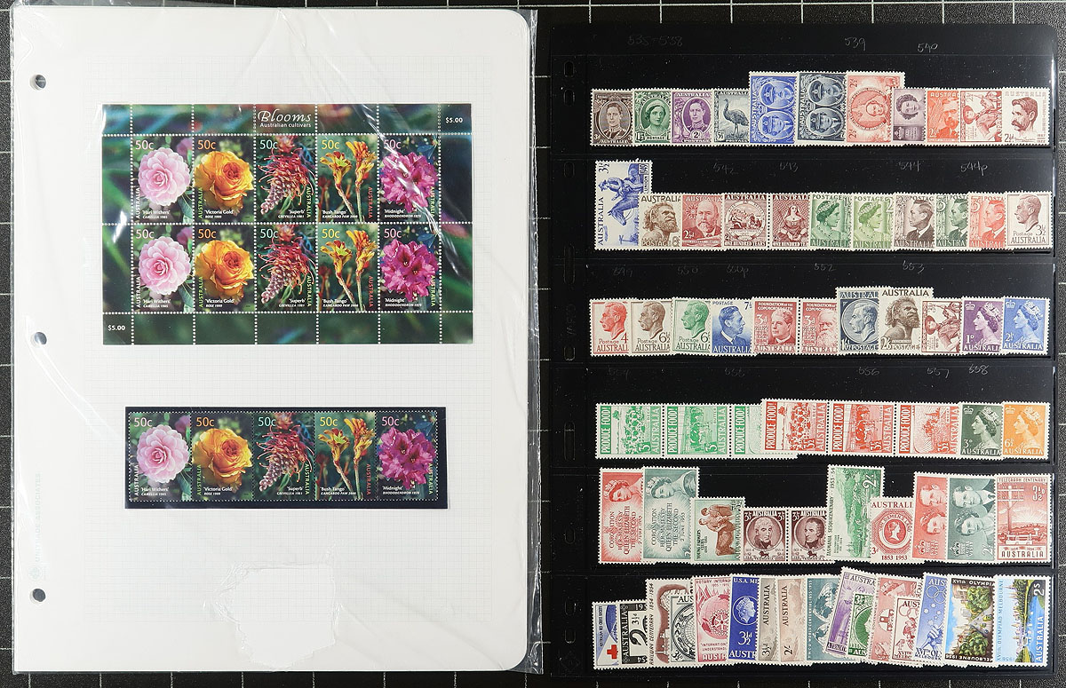 Collection of primarily never hinged Australia, 1940's-2003, containing many hundreds of stamps in over 30 album or stock pages. The collection generally ranges from Scott #252a/2158, with strength from the mid 1980's onwards, including several sets. gutter pairs, and a few souvenir sheets and panes. Face value alone would be several hundreds of dollars. A lovely lot with a variety of purposes. Very fine. Owner's older 2015 Scott US$1,059.00 =