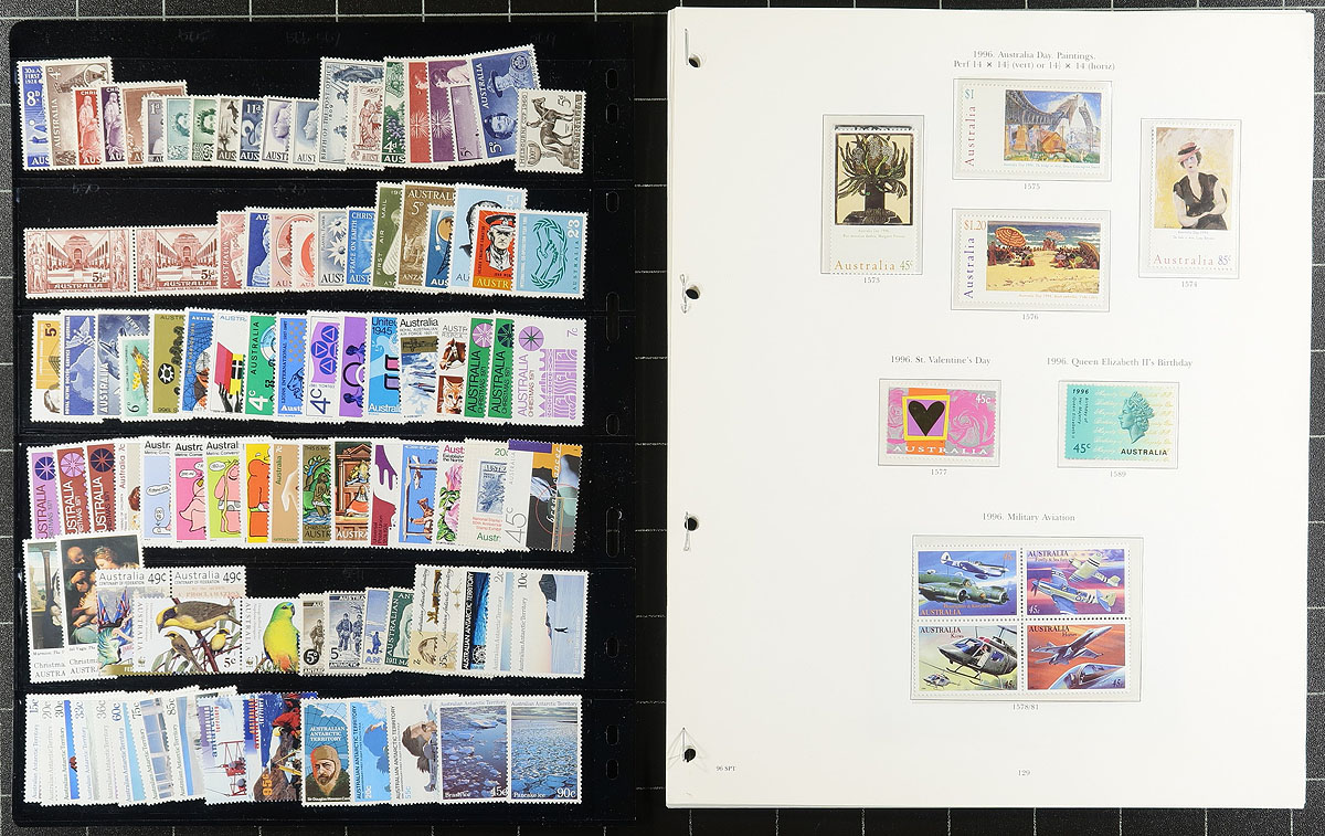 Collection of primarily never hinged Australia, 1940's-2003, containing many hundreds of stamps in over 30 album or stock pages. The collection generally ranges from Scott #252a/2158, with strength from the mid 1980's onwards, including several sets. gutter pairs, and a few souvenir sheets and panes. Face value alone would be several hundreds of dollars. A lovely lot with a variety of purposes. Very fine. Owner's older 2015 Scott US$1,059.00 =