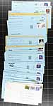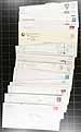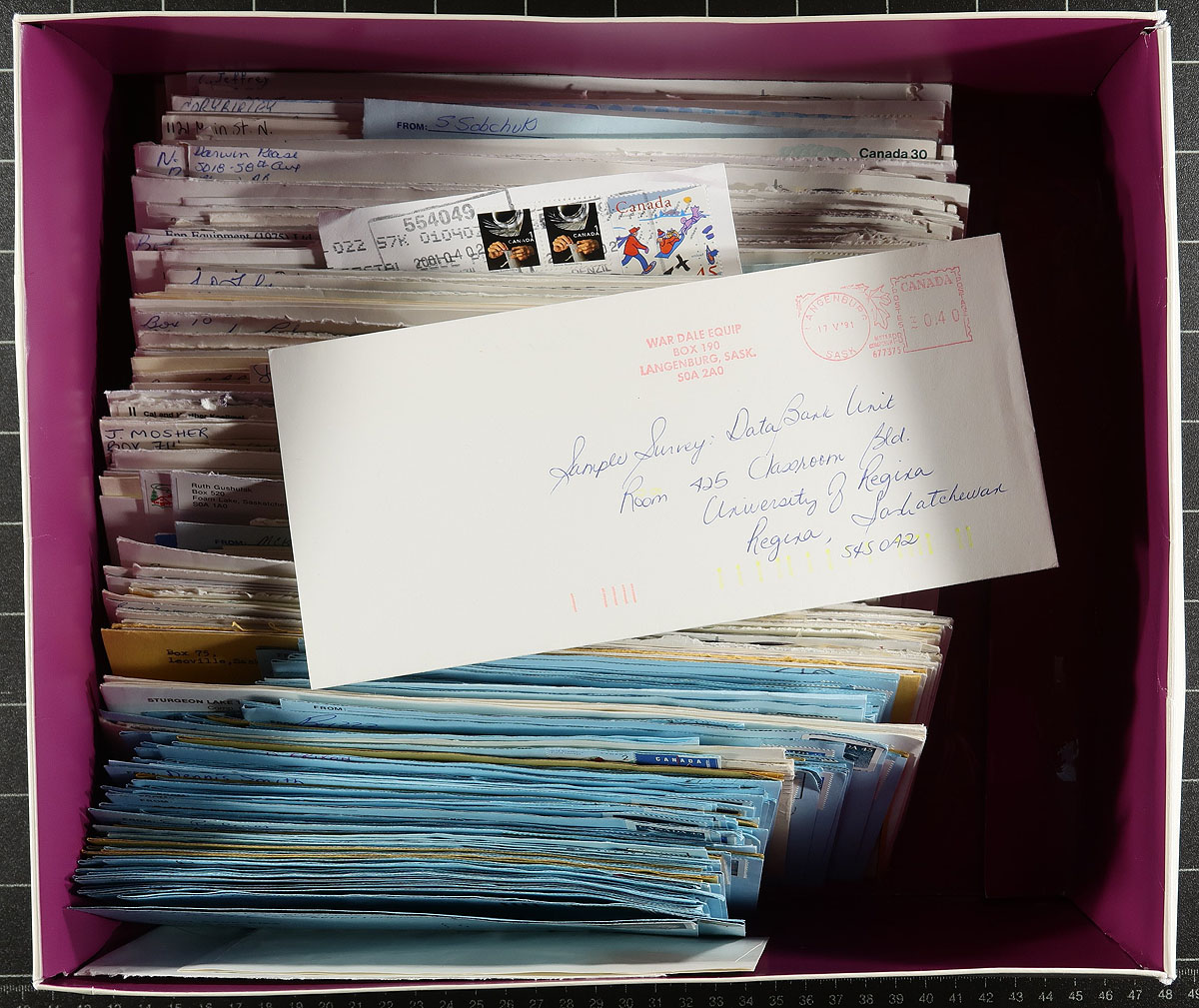 Saskatchewan Postmarks. Accumulation of roughly 400 covers collected for Saskatechwan town postmarks, loose in a box, generally from the 1980's but did spot a few items on either side of the given range. The lot contains a few hundred different towns, ranging from A to Y including Livelong, Unity, Blaine Lake, Carrot River, Buffalo Narrows, Aylsham, Aberdeen, Pilot Butte, Vanguard, and much more. Postmarks include cds, duplex, POCON, Klussendorf, and other types, including sub offices, with some towns having a variety of postmarks or frankings. All the covers appear to be commercial in nature (noting many #10 sized envelopes), with some having corner advertising. A nice lot for the postmark hunter, a few faults to be expected, overall fine to very fine. Estimate =