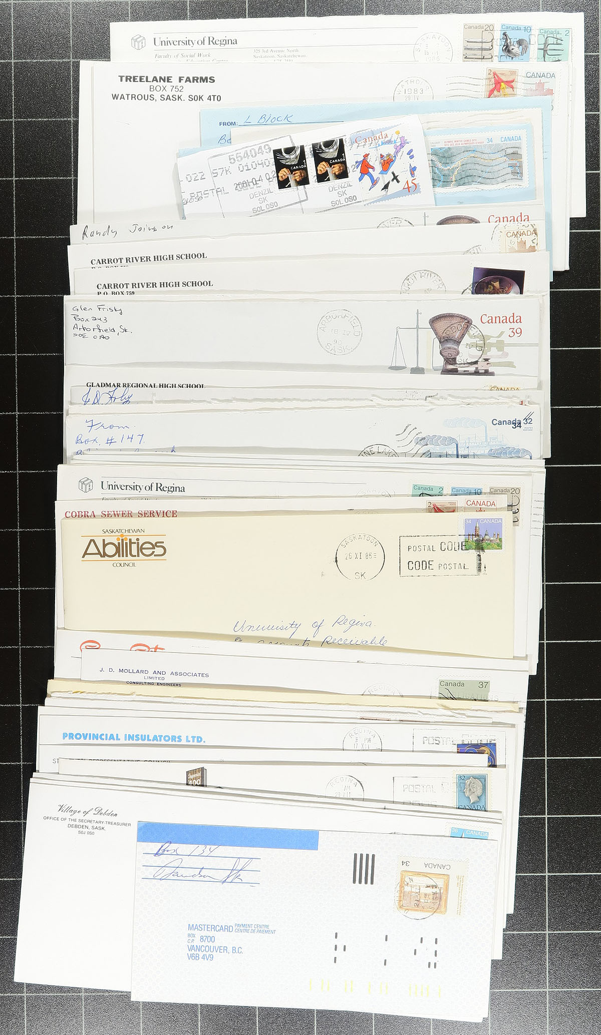 Saskatchewan Postmarks. Accumulation of roughly 400 covers collected for Saskatechwan town postmarks, loose in a box, generally from the 1980's but did spot a few items on either side of the given range. The lot contains a few hundred different towns, ranging from A to Y including Livelong, Unity, Blaine Lake, Carrot River, Buffalo Narrows, Aylsham, Aberdeen, Pilot Butte, Vanguard, and much more. Postmarks include cds, duplex, POCON, Klussendorf, and other types, including sub offices, with some towns having a variety of postmarks or frankings. All the covers appear to be commercial in nature (noting many #10 sized envelopes), with some having corner advertising. A nice lot for the postmark hunter, a few faults to be expected, overall fine to very fine. Estimate =