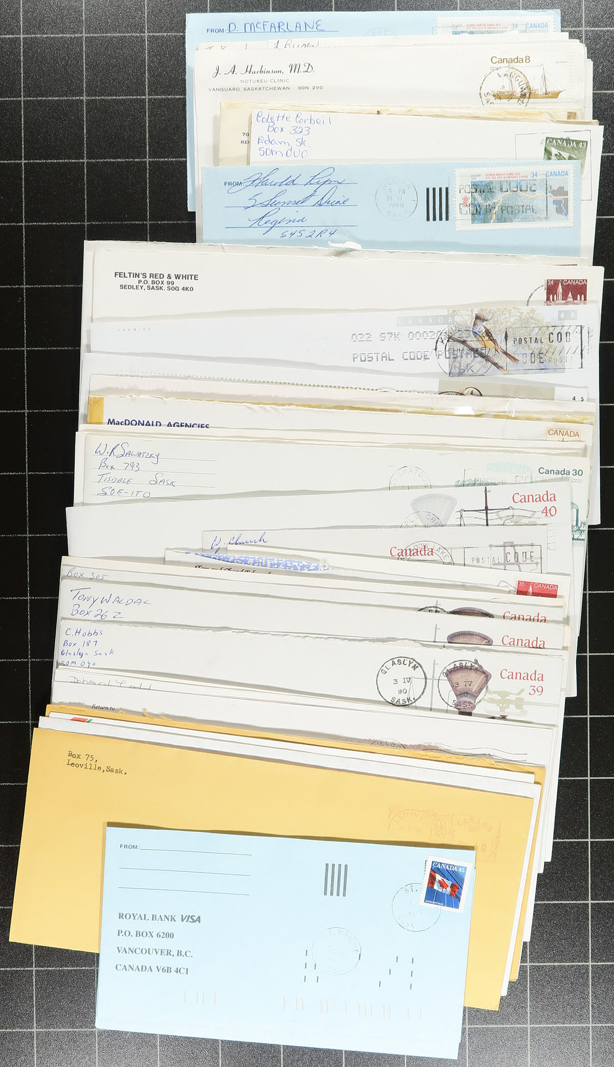 Saskatchewan Postmarks. Accumulation of roughly 400 covers collected for Saskatechwan town postmarks, loose in a box, generally from the 1980's but did spot a few items on either side of the given range. The lot contains a few hundred different towns, ranging from A to Y including Livelong, Unity, Blaine Lake, Carrot River, Buffalo Narrows, Aylsham, Aberdeen, Pilot Butte, Vanguard, and much more. Postmarks include cds, duplex, POCON, Klussendorf, and other types, including sub offices, with some towns having a variety of postmarks or frankings. All the covers appear to be commercial in nature (noting many #10 sized envelopes), with some having corner advertising. A nice lot for the postmark hunter, a few faults to be expected, overall fine to very fine. Estimate =