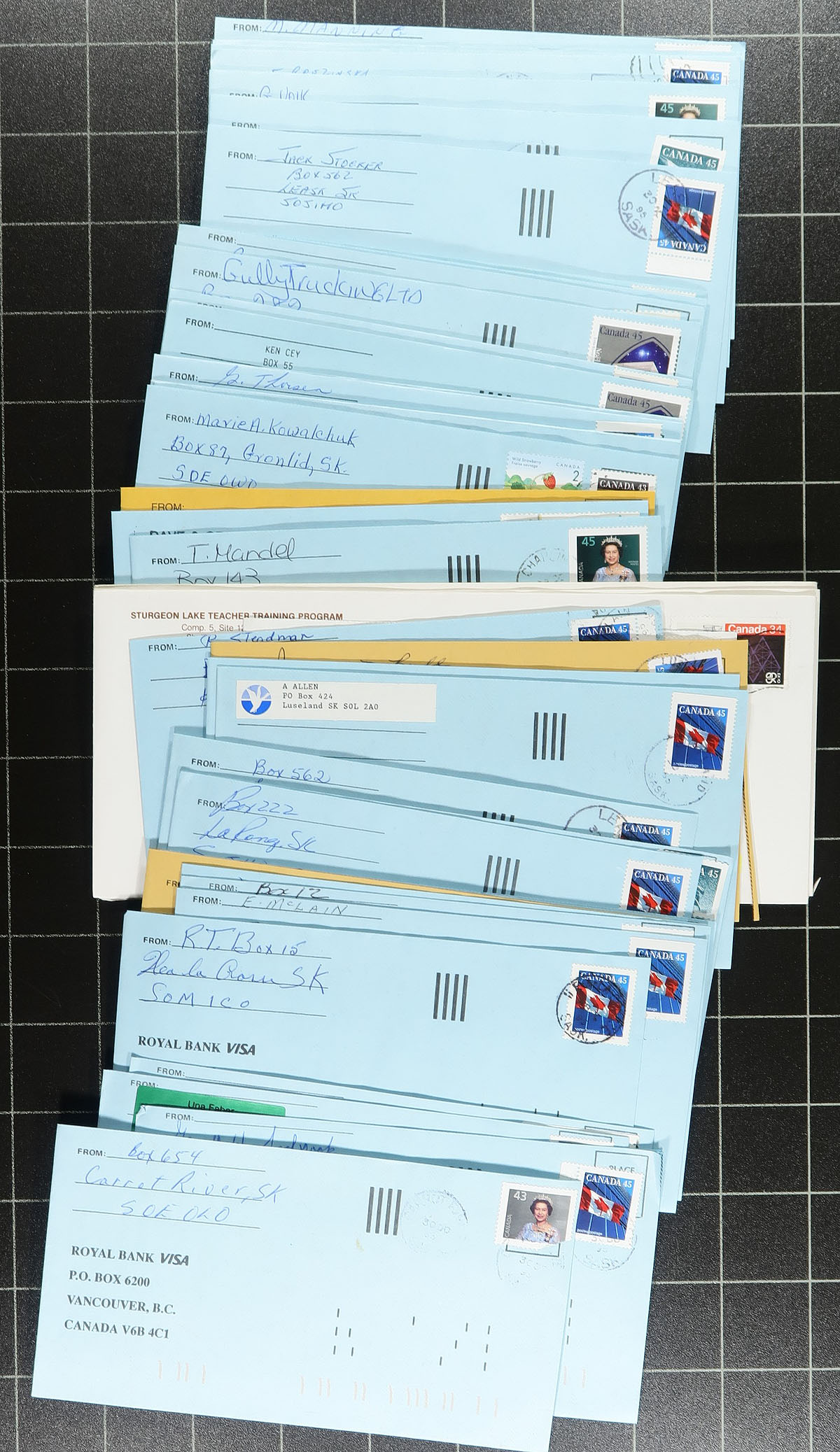 Saskatchewan Postmarks. Accumulation of roughly 400 covers collected for Saskatechwan town postmarks, loose in a box, generally from the 1980's but did spot a few items on either side of the given range. The lot contains a few hundred different towns, ranging from A to Y including Livelong, Unity, Blaine Lake, Carrot River, Buffalo Narrows, Aylsham, Aberdeen, Pilot Butte, Vanguard, and much more. Postmarks include cds, duplex, POCON, Klussendorf, and other types, including sub offices, with some towns having a variety of postmarks or frankings. All the covers appear to be commercial in nature (noting many #10 sized envelopes), with some having corner advertising. A nice lot for the postmark hunter, a few faults to be expected, overall fine to very fine. Estimate =