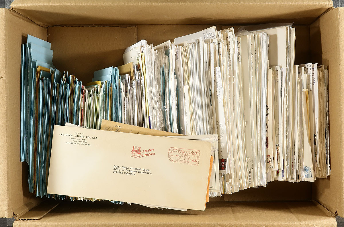 British Columbia Postmarks. Accumulation of roughly 600 covers collected for British Columbia postmarks, loose in a box, generally ranging from the 1960's to the early 2000's, with a few items possible on either side of the given range. The lot contains several hundred different towns (including many small towns), ranging from A to Y including Crescent Beach, Okanagan Falls, Adams Lake, Baldy Hughes, Halfmoon Bay, Gold River, Gillies Bay, Garibaldi Highlands, Canal Flats, Alert Bay, and much more. Postmarks include cds, POCON, Klussendorf, slogan, spray on, and a few other types, with some towns having different postmarks or frankings. All the covers appear to be commercial in nature, including several #10 sized envelopes, with some having corner advertising. A nice lot for the postmark hunter, a few faults to be expected, overall fine to very fine. Estimate =