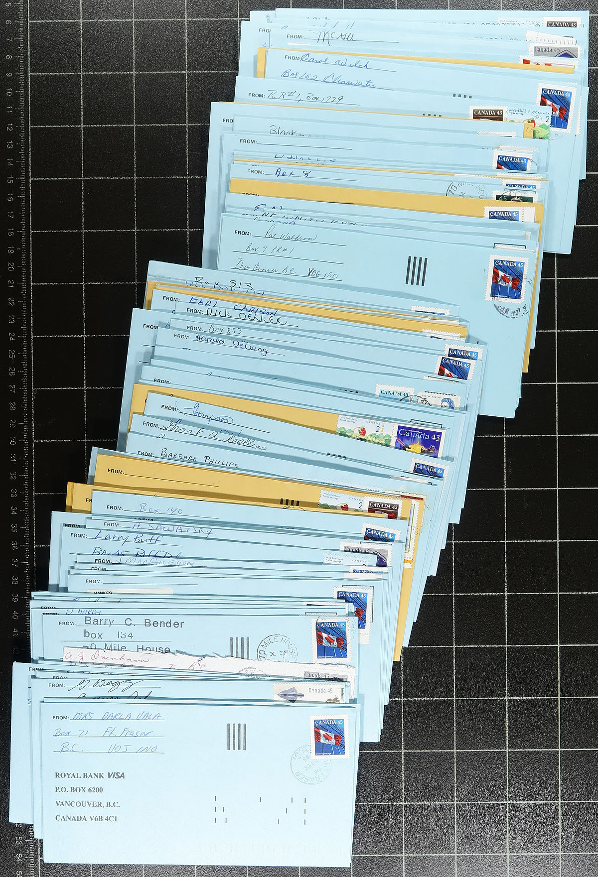 British Columbia Postmarks. Accumulation of roughly 600 covers collected for British Columbia postmarks, loose in a box, generally ranging from the 1960's to the early 2000's, with a few items possible on either side of the given range. The lot contains several hundred different towns (including many small towns), ranging from A to Y including Crescent Beach, Okanagan Falls, Adams Lake, Baldy Hughes, Halfmoon Bay, Gold River, Gillies Bay, Garibaldi Highlands, Canal Flats, Alert Bay, and much more. Postmarks include cds, POCON, Klussendorf, slogan, spray on, and a few other types, with some towns having different postmarks or frankings. All the covers appear to be commercial in nature, including several #10 sized envelopes, with some having corner advertising. A nice lot for the postmark hunter, a few faults to be expected, overall fine to very fine. Estimate =
