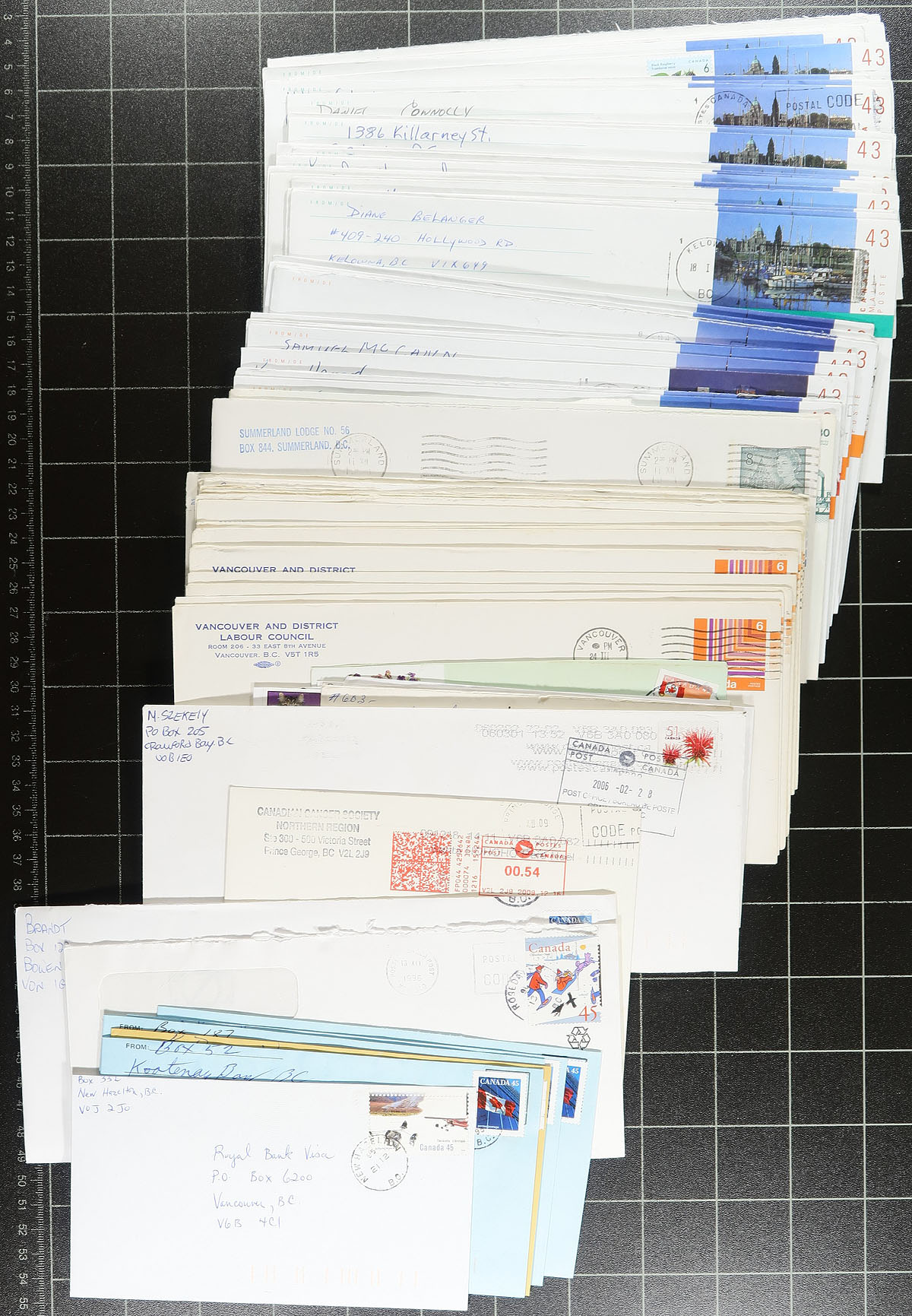 British Columbia Postmarks. Accumulation of roughly 600 covers collected for British Columbia postmarks, loose in a box, generally ranging from the 1960's to the early 2000's, with a few items possible on either side of the given range. The lot contains several hundred different towns (including many small towns), ranging from A to Y including Crescent Beach, Okanagan Falls, Adams Lake, Baldy Hughes, Halfmoon Bay, Gold River, Gillies Bay, Garibaldi Highlands, Canal Flats, Alert Bay, and much more. Postmarks include cds, POCON, Klussendorf, slogan, spray on, and a few other types, with some towns having different postmarks or frankings. All the covers appear to be commercial in nature, including several #10 sized envelopes, with some having corner advertising. A nice lot for the postmark hunter, a few faults to be expected, overall fine to very fine. Estimate =