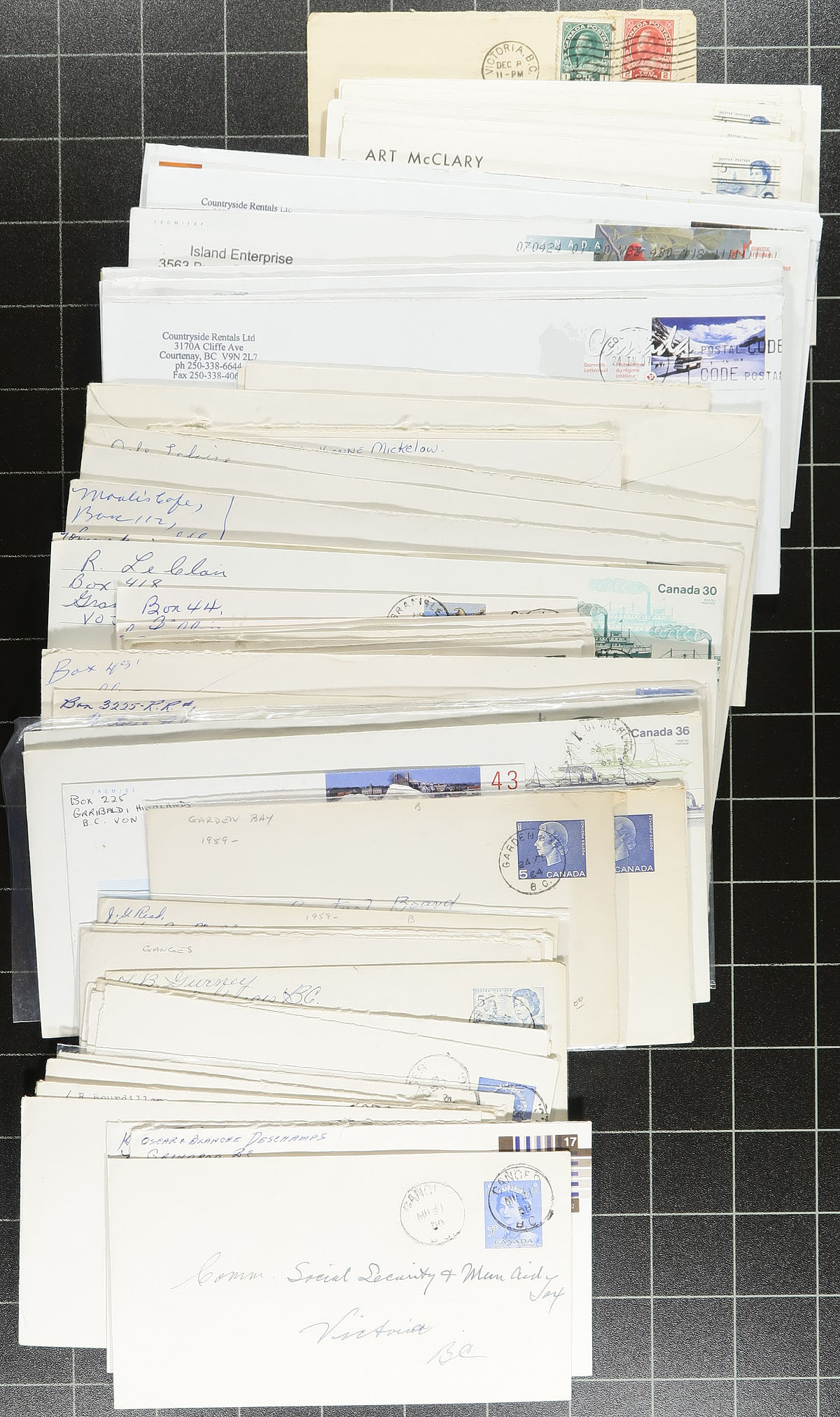 British Columbia Postmarks. Accumulation of roughly 600 covers collected for British Columbia postmarks, loose in a box, generally ranging from the 1960's to the early 2000's, with a few items possible on either side of the given range. The lot contains several hundred different towns (including many small towns), ranging from A to Y including Crescent Beach, Okanagan Falls, Adams Lake, Baldy Hughes, Halfmoon Bay, Gold River, Gillies Bay, Garibaldi Highlands, Canal Flats, Alert Bay, and much more. Postmarks include cds, POCON, Klussendorf, slogan, spray on, and a few other types, with some towns having different postmarks or frankings. All the covers appear to be commercial in nature, including several #10 sized envelopes, with some having corner advertising. A nice lot for the postmark hunter, a few faults to be expected, overall fine to very fine. Estimate =